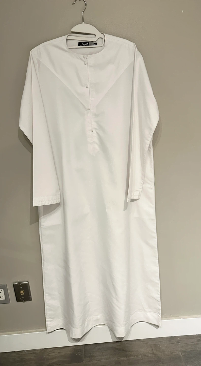 Selling a white thobe, a traditional garment for men. In great condition and is a simple, elegant design. Perfect for cultural events or everyday wear!
