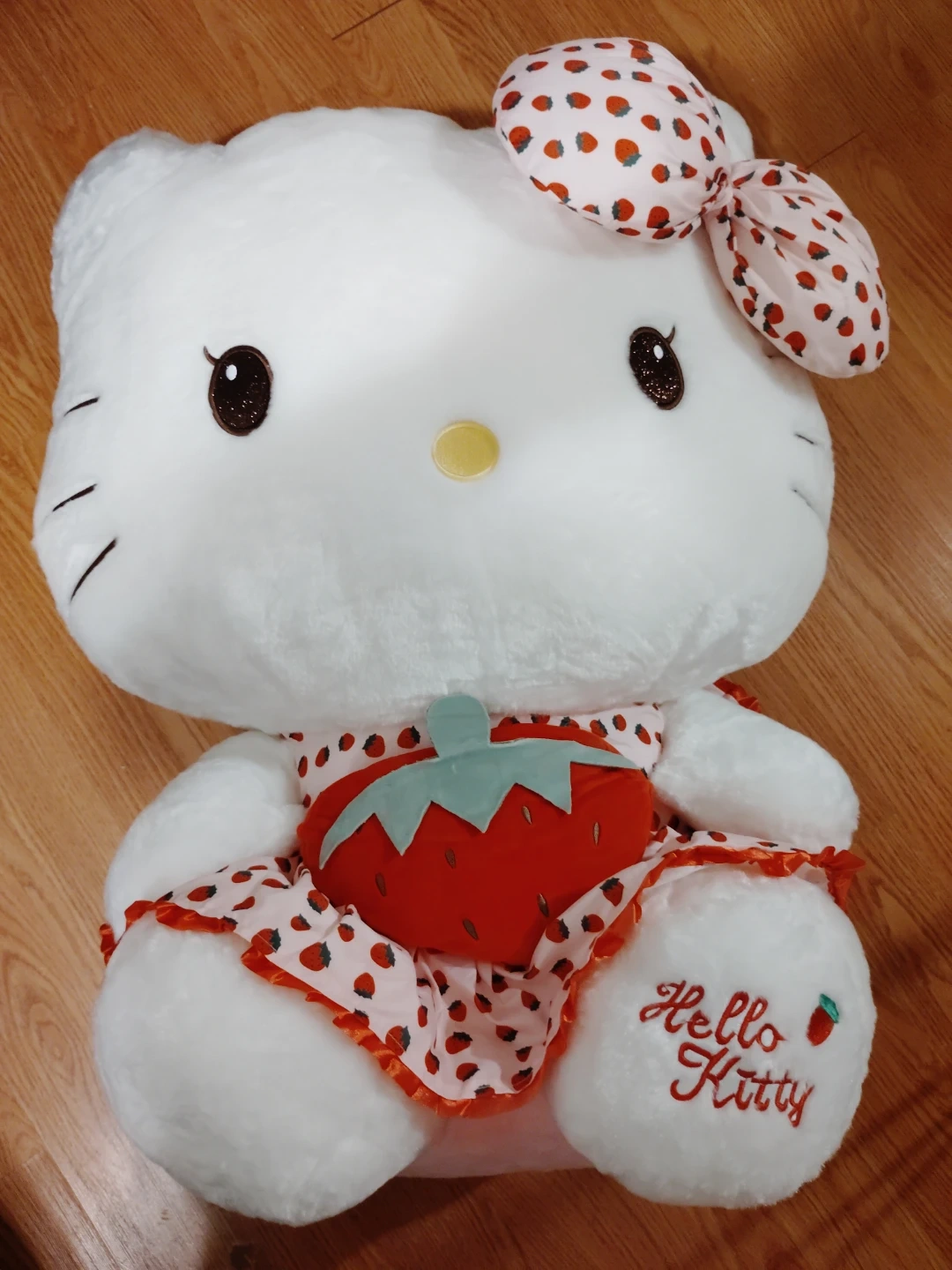 Selling a super cute Hello Kitty plush doll! It's in great condition and features a sweet strawberry design on her dress and bow. Perfect for any Hello Kitty fan or as a cuddly companion. 30 inches tall by 24 inches wide. The bow is loose on one of the ends. Feel free to make an offer