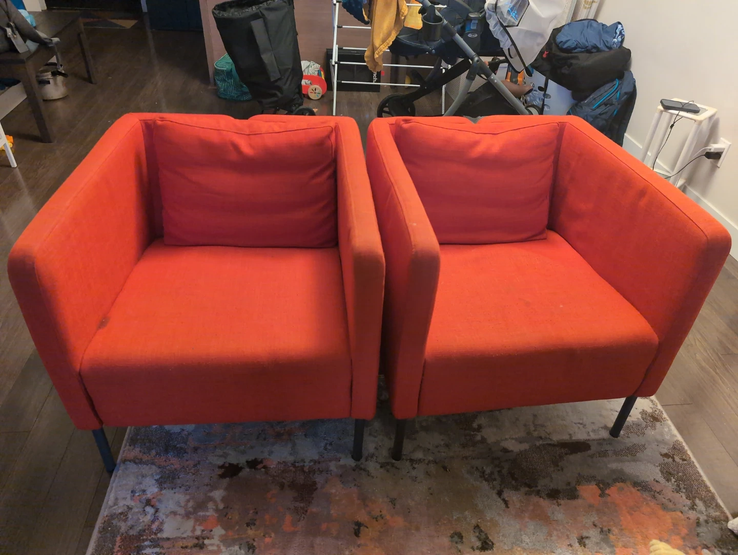 Selling two armchairs, perfect for a living room or den! They're a vibrant red colour and in good condition. They have a modern design with a comfortable cushion.