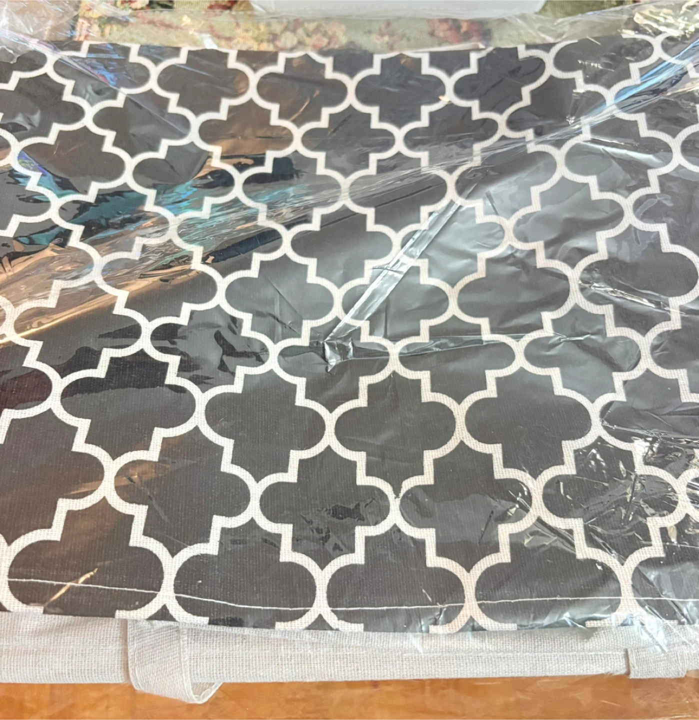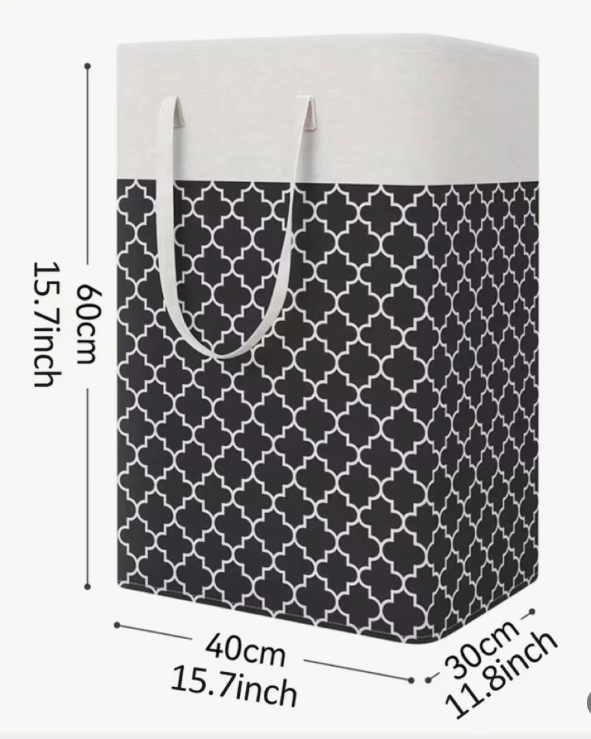 I have a brand new laundry hamper still in its original packaging! It features a stylish black and white pattern. The hamper has convenient handles for easy carrying.