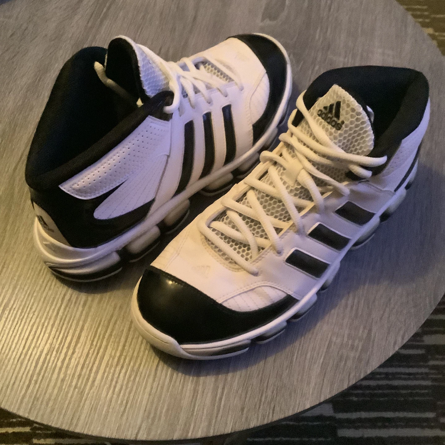 Selling a pair of Adidas basketball shoes in black and white. They're in great shape and ready for the court!