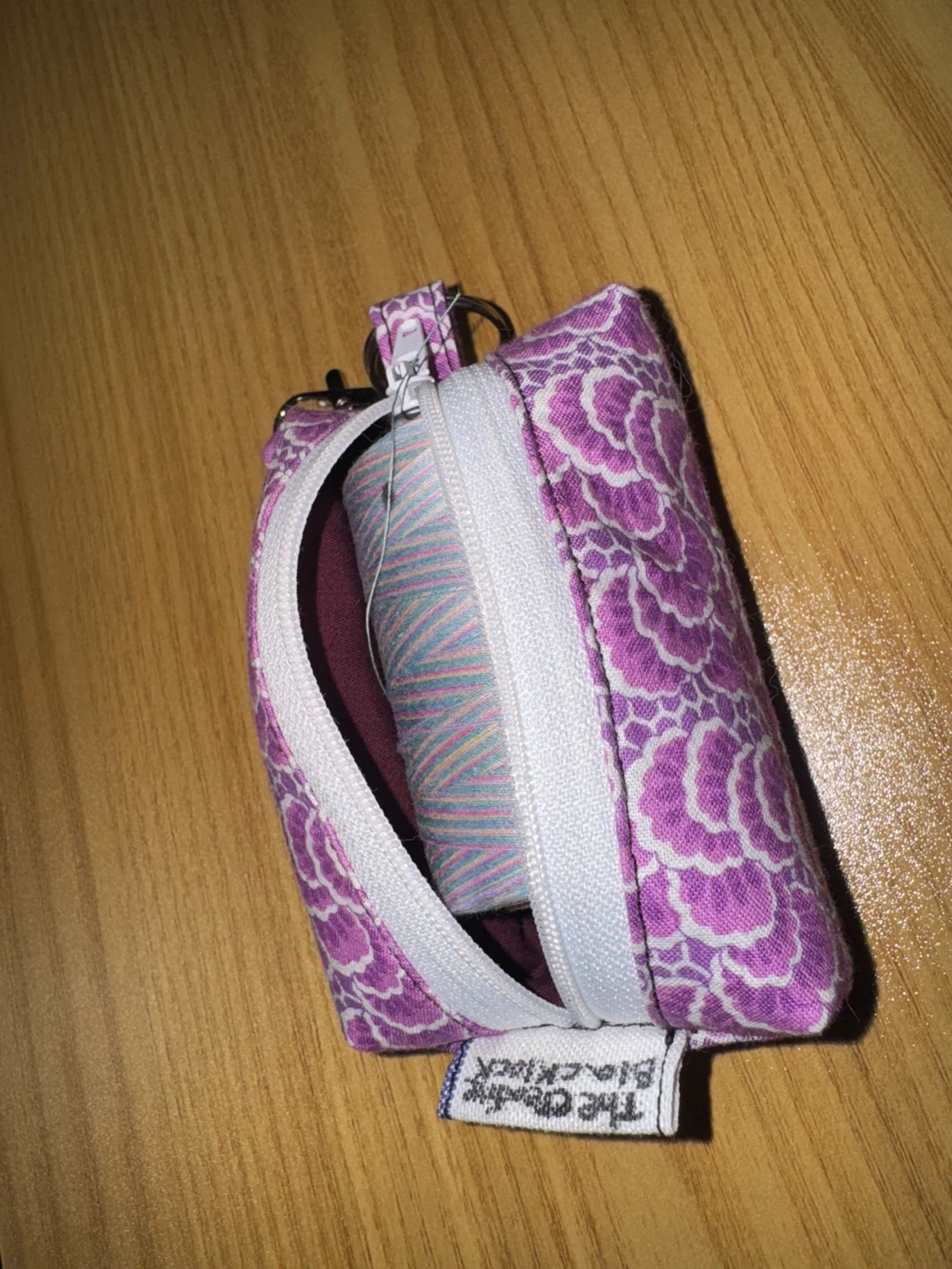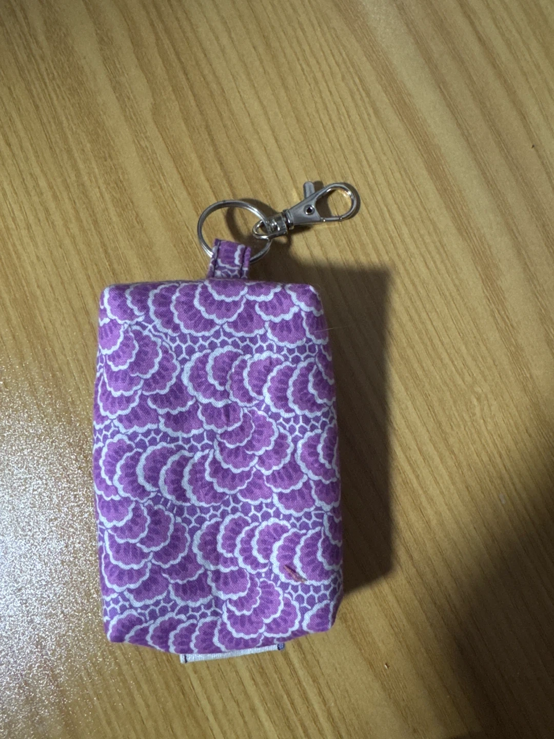 This is a cute key chain bag hand made. It has a zipper and a key chain hook. It's perfect for holding small items, travel emergency kit, change purse, makeup bag.