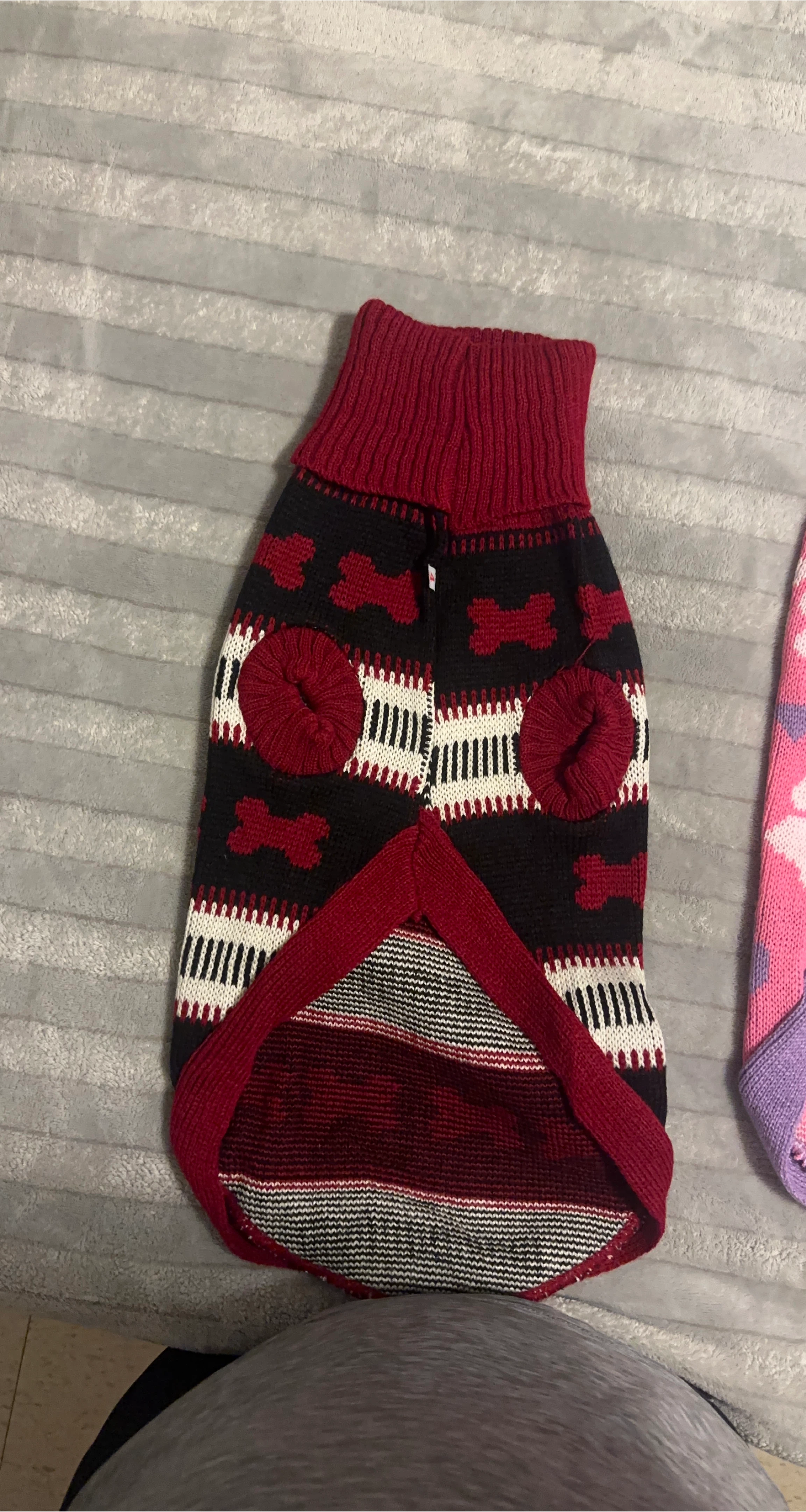 Cute dog sweater with a red, black, and white pattern. It's in good condition and ready for your furry friend to stay warm!