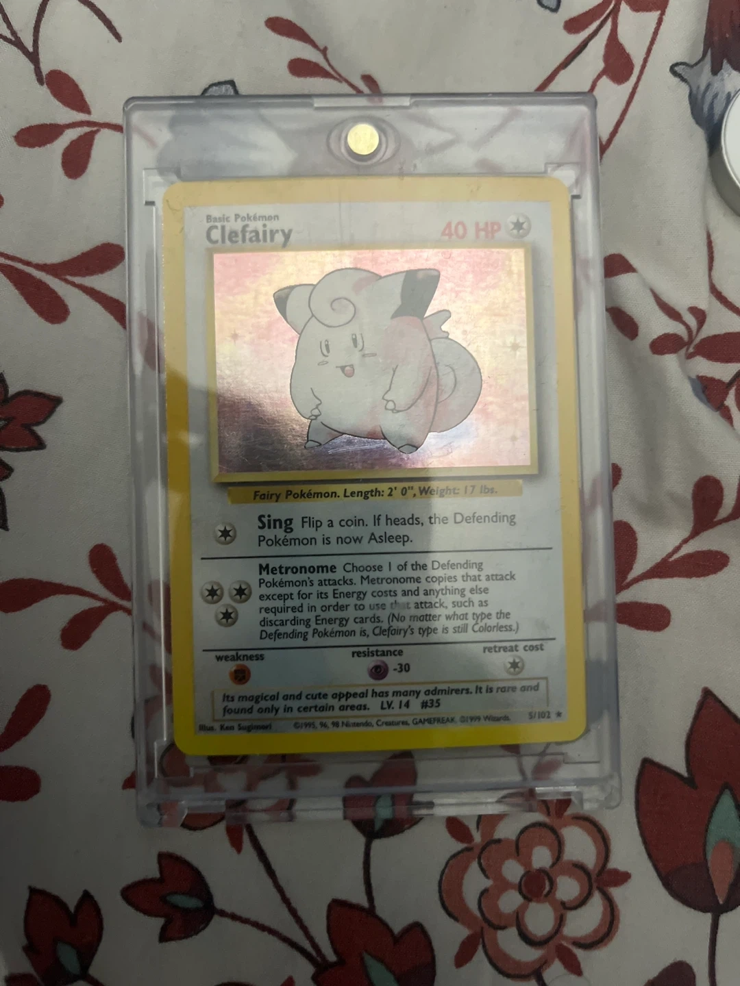 Selling a Clefairy Pokemon card! It's in great condition and comes in a protective case. This card has a magical and cute appeal and is rare to find!