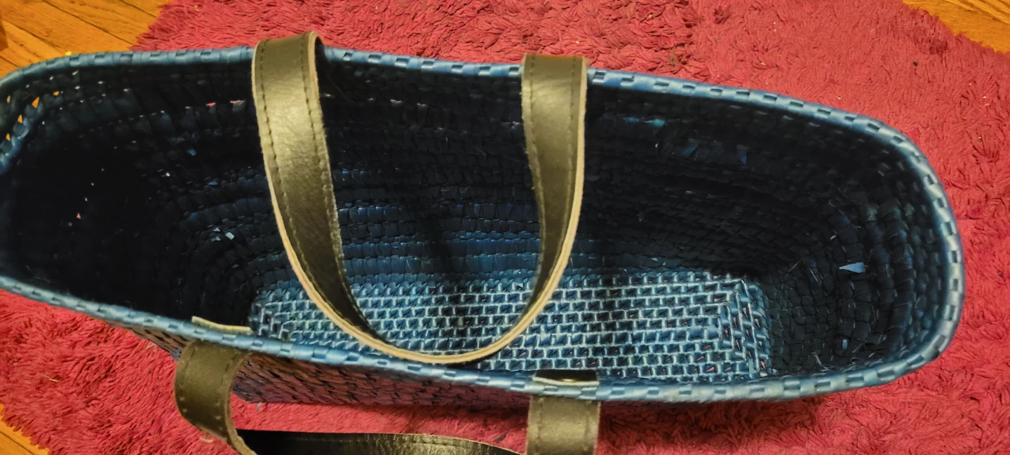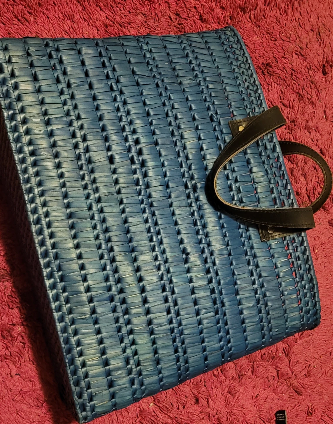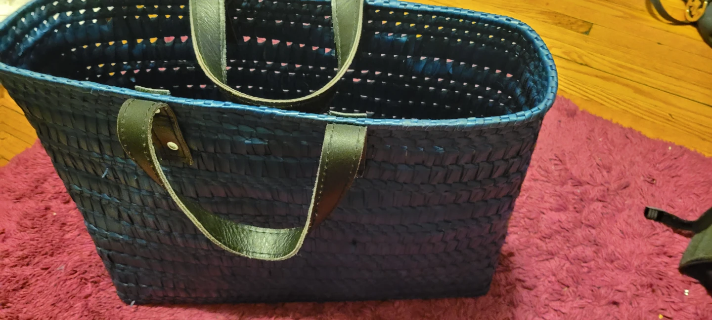 Here's a stylish blue woven tote bag with black handles! It's perfect for carrying your everyday essentials. The woven design gives it a unique and eye-catching look. It's in great condition and ready for a new owner!