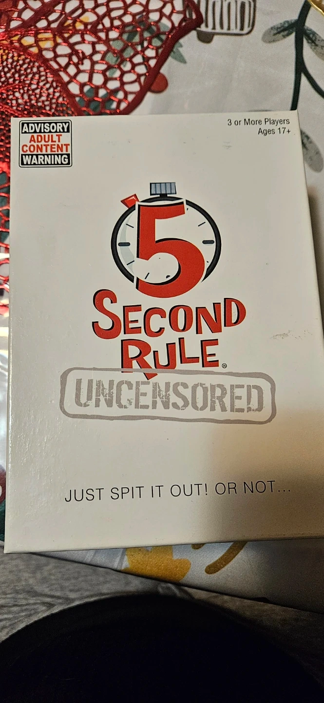 Selling the 5 Second Rule Uncensored game! It's perfect for adult game nights. The game includes 150 2-sided cards, a twisted timer, and the rules. It's for 3 or more players, ages 17+. Bought but barely used.
