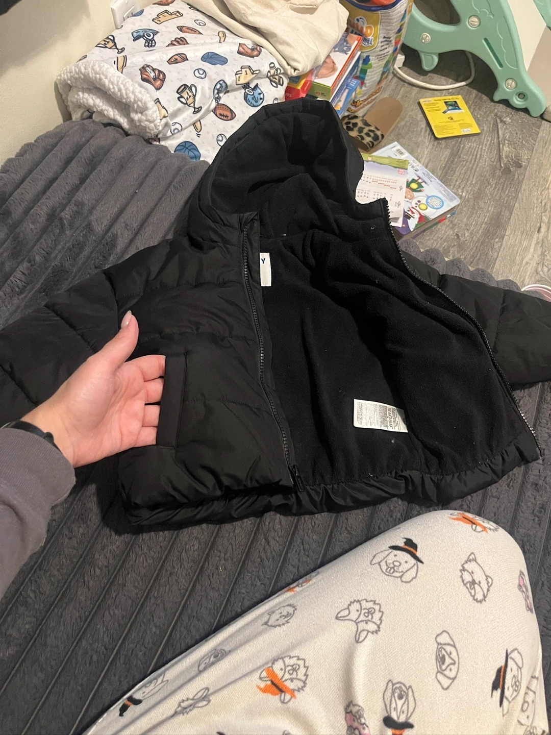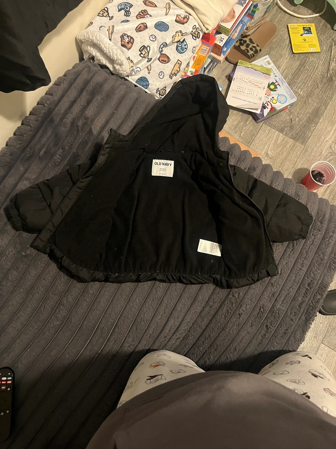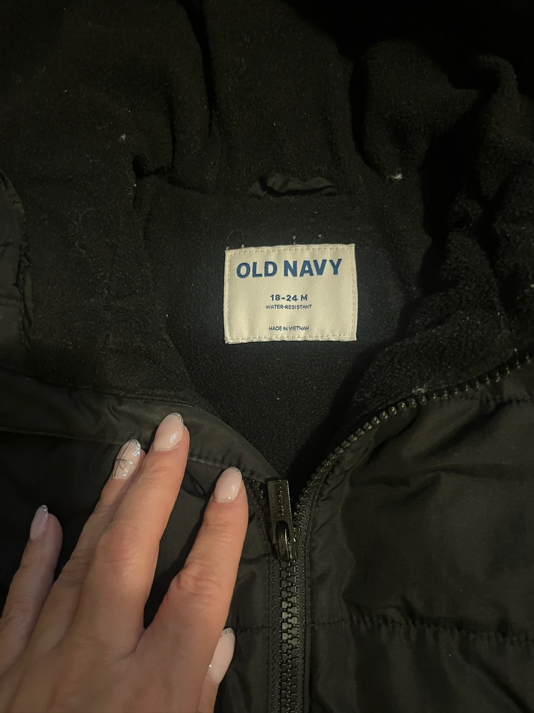 Here's a cute Old Navy black puffer jacket for your little one! It's size 18-24 months and perfect for keeping them warm and cozy. This jacket is in great condition and ready for a new adventure.