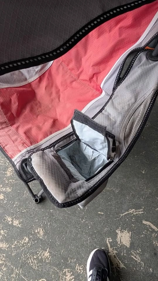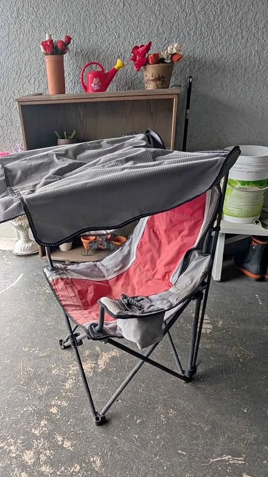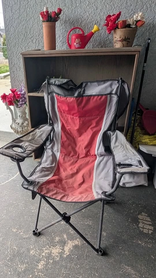 Comfortable folding camping chair with built-in sun shade, insulated cooler pouch on one armrest and a cupholder on the other armrest. Sturdy frame, easy to fold and transport—great for camping, beach days, fishing, or outdoor events.