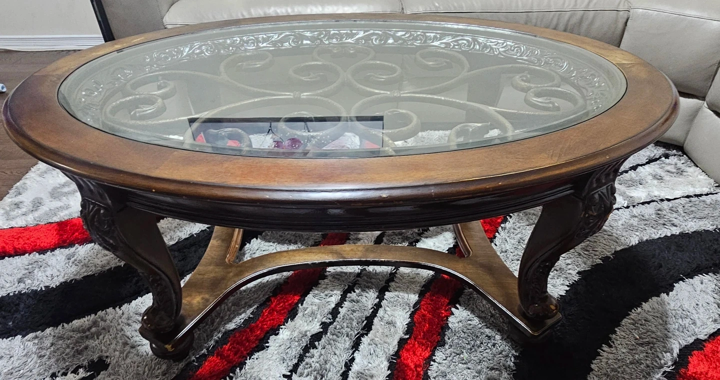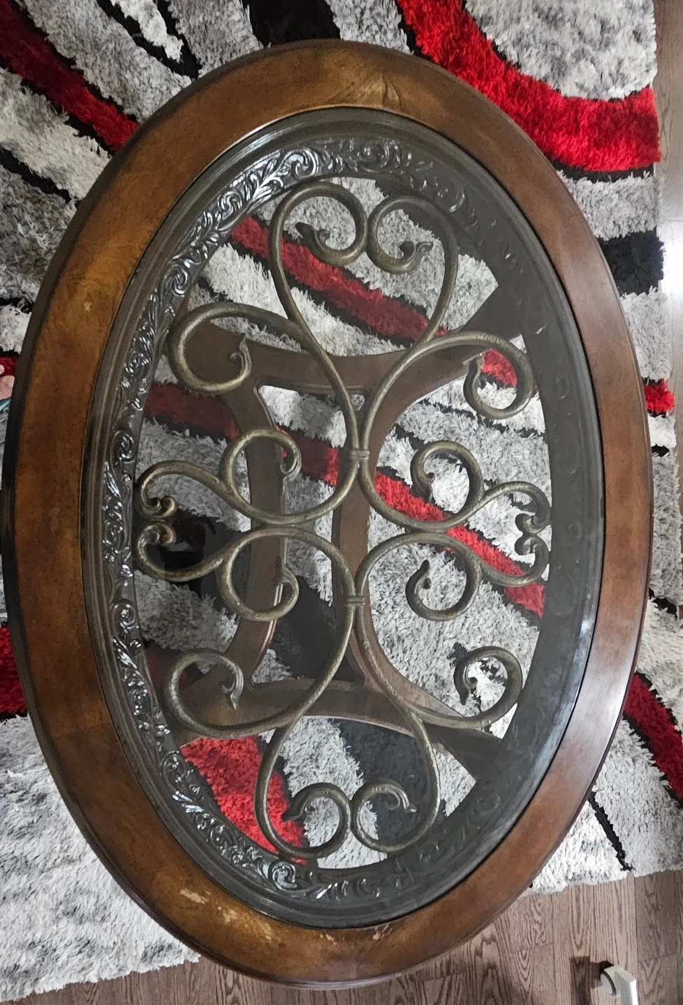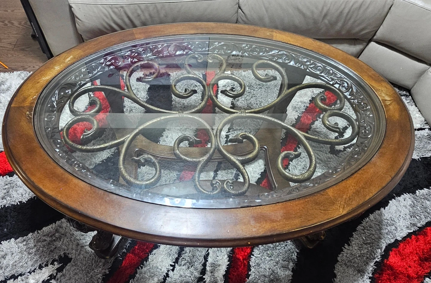 Selling a beautiful oval coffee table with a glass top and ornate metal detailing underneath. It has a wooden frame and legs with a lower shelf. It's in great condition and would be a lovely addition to any living room!