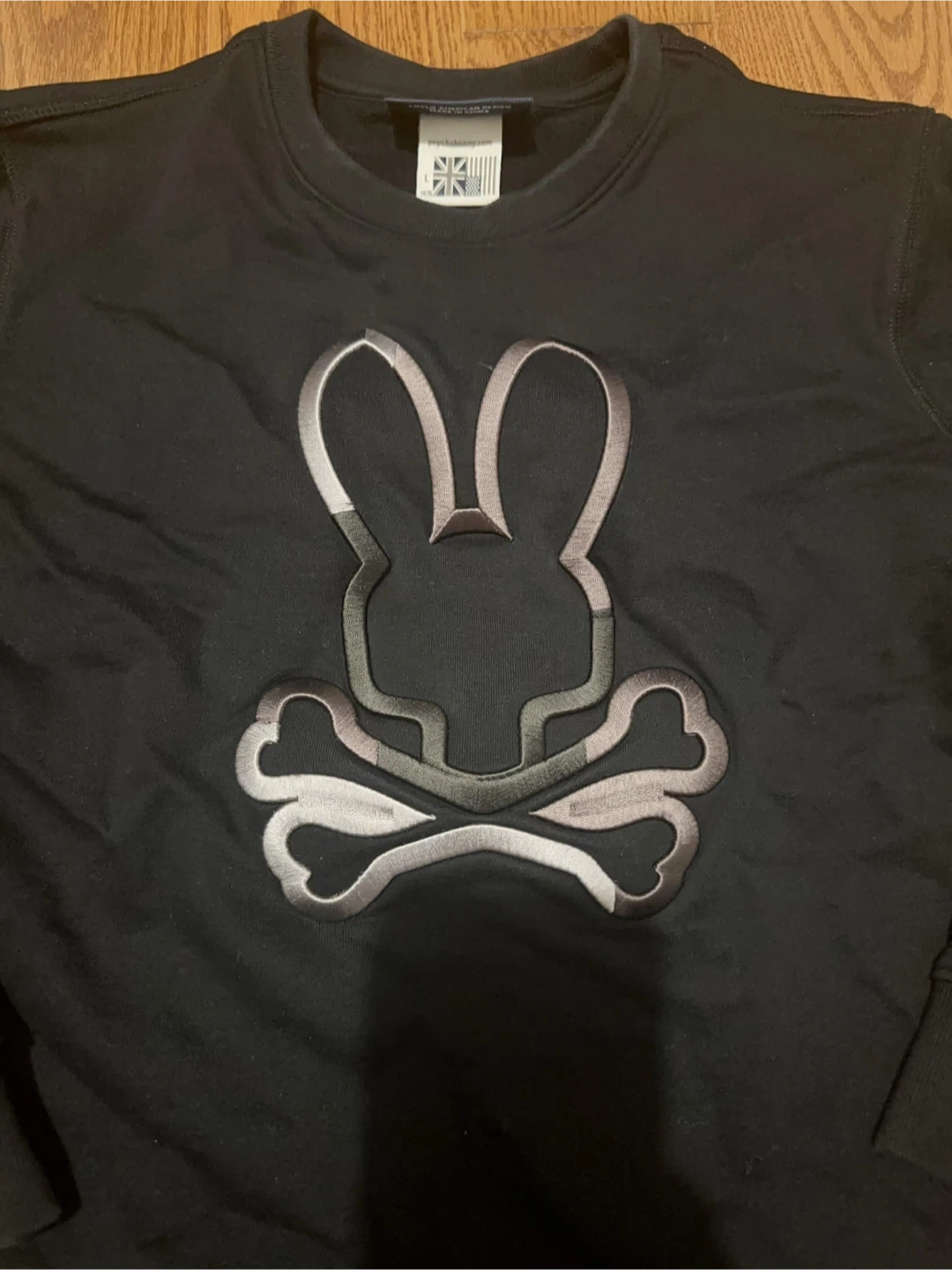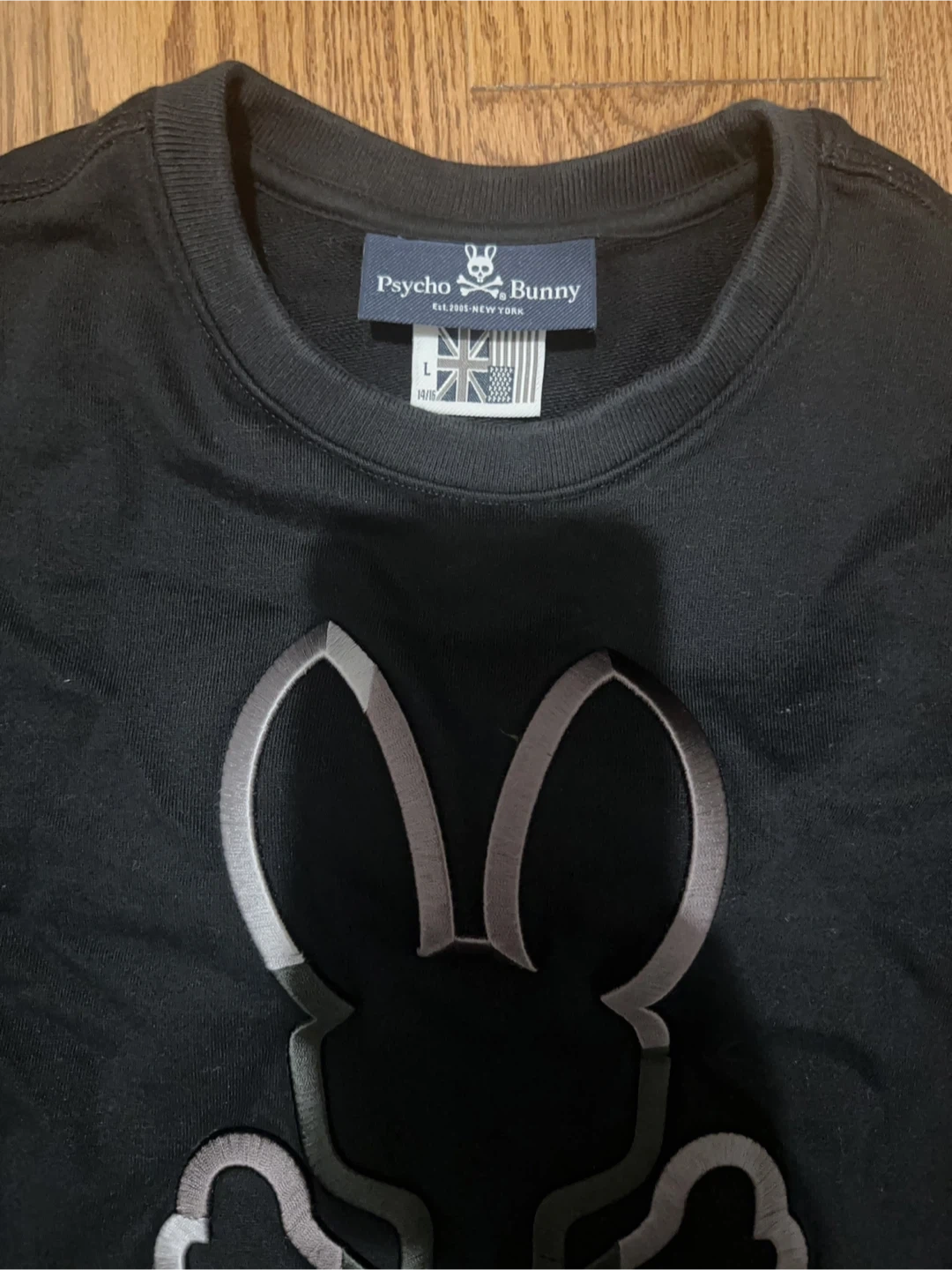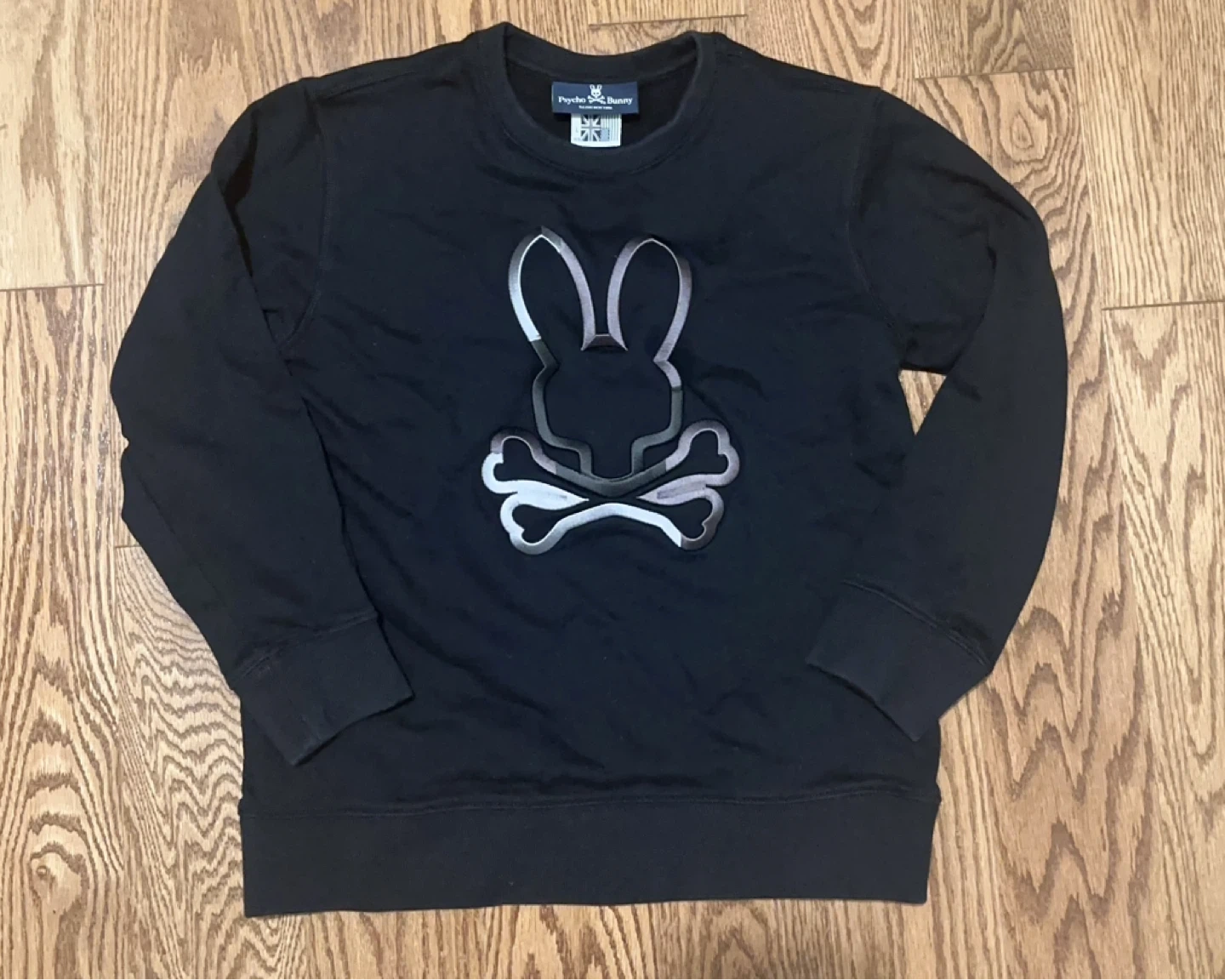 Selling a Psycho Bunny sweatshirt in size teen L. It's a stylish black colour with the iconic bunny and crossbones logo on the front. Great for casual wear!