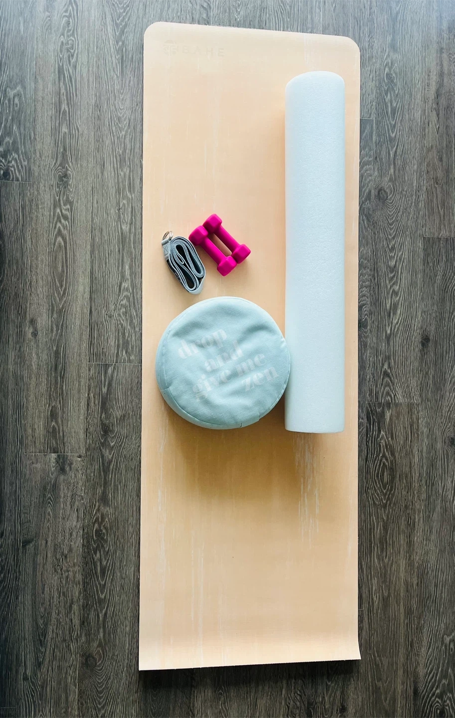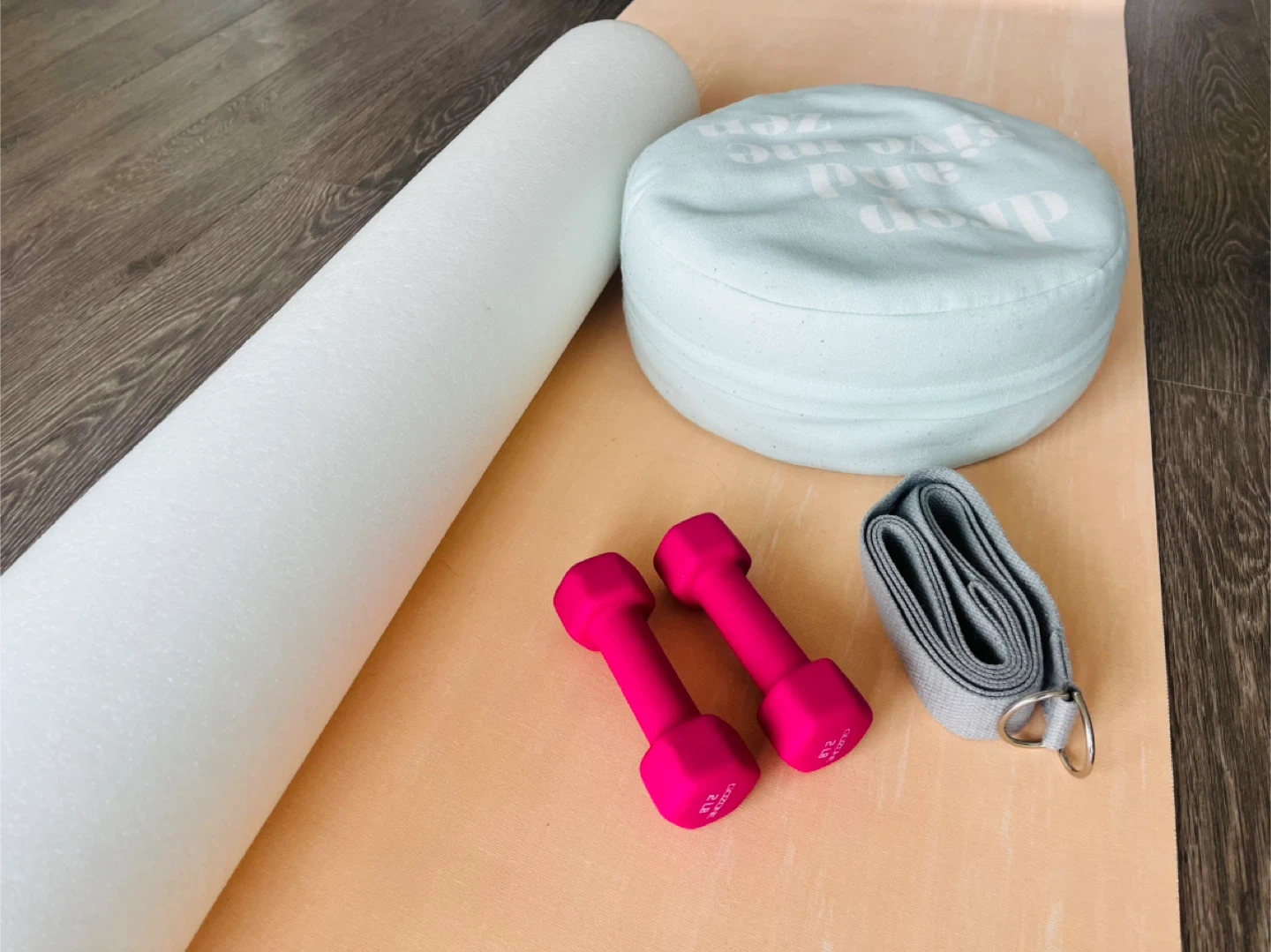 Selling a yoga set that includes a mat, foam roller, small weights, a yoga strap and a meditation cushion! Perfect for getting started with your yoga or fitness journey