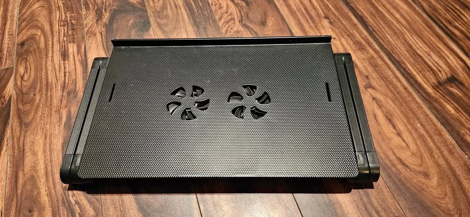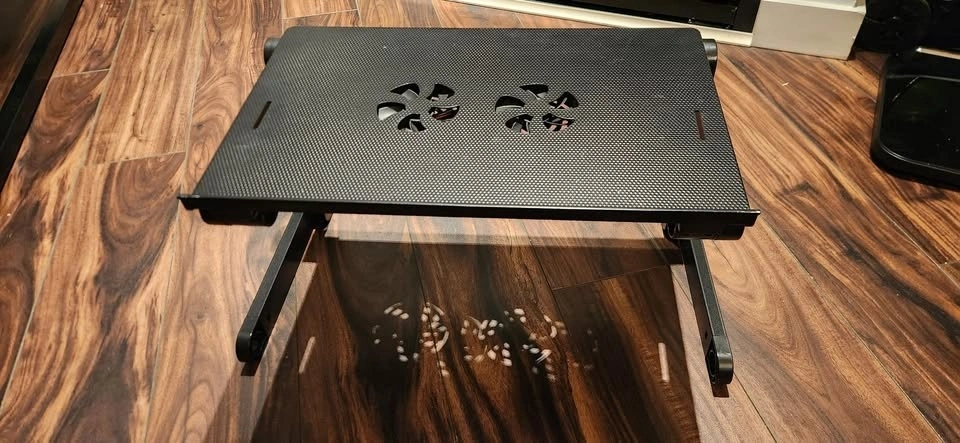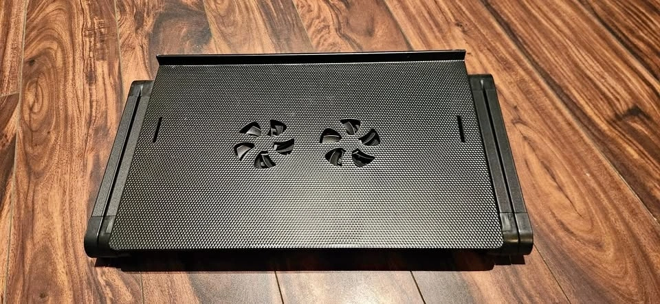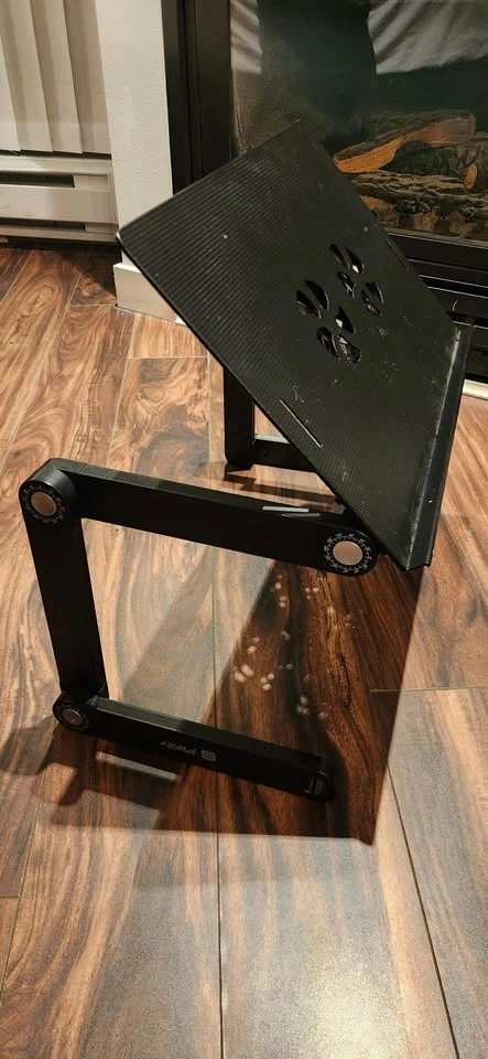 It has many articulating angles. Good to put laptop in bed or eat in bed. Has a fan for cooling but I lost the adapter.