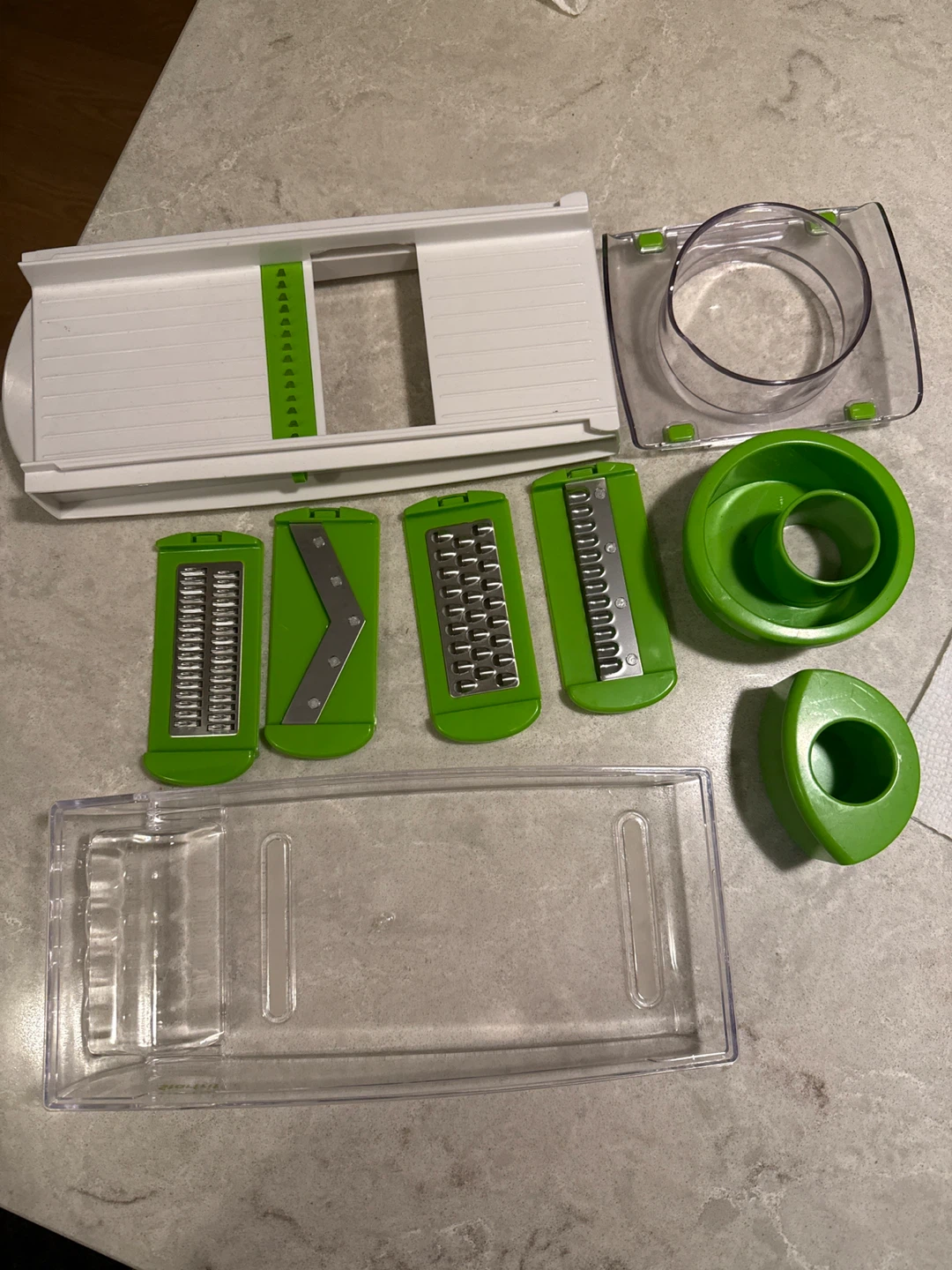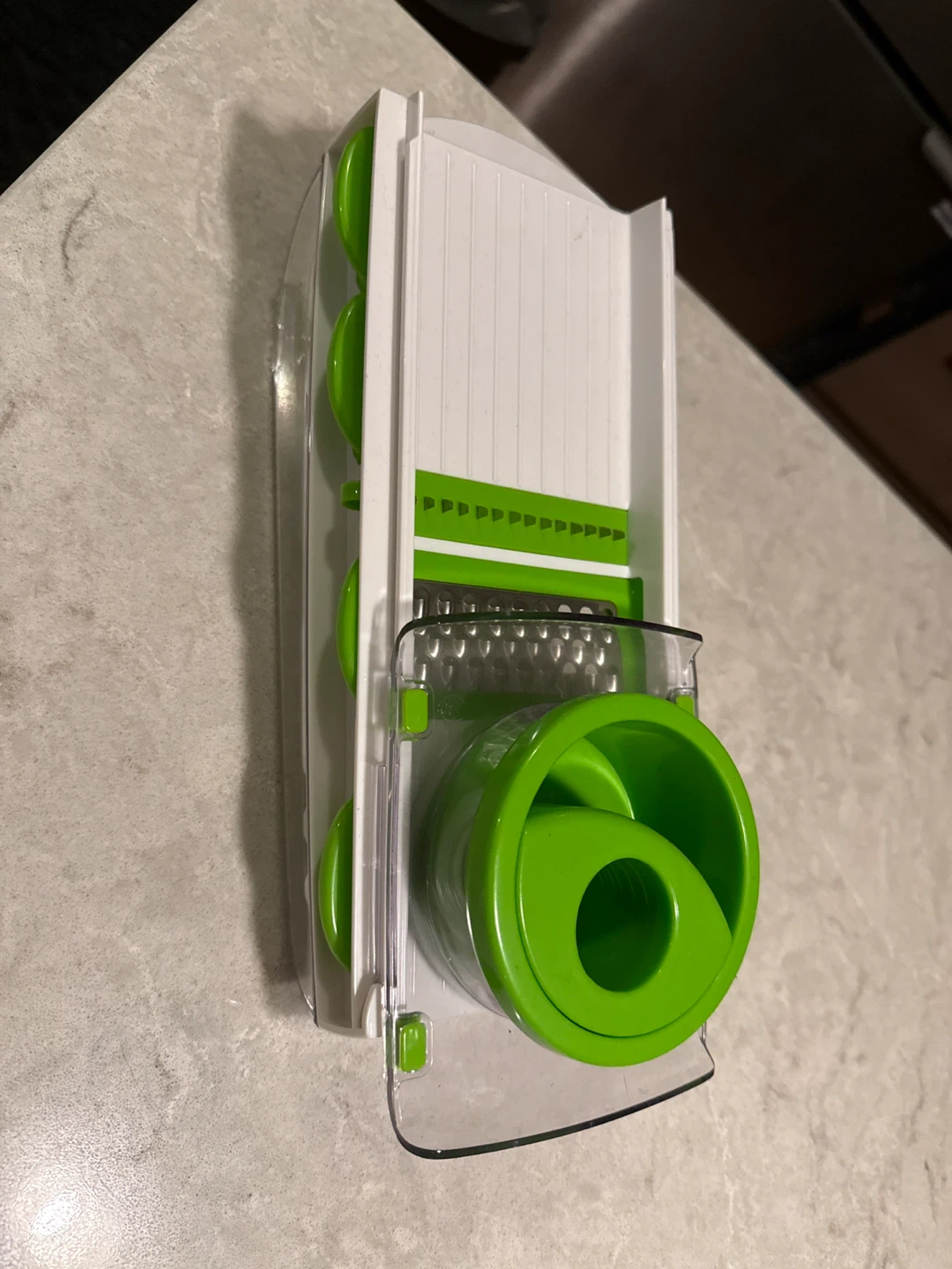 (AI) This mandoline slicer is in great condition and ready to help you prep your veggies! It comes with multiple blades for different cuts and a safety holder to protect your fingers.