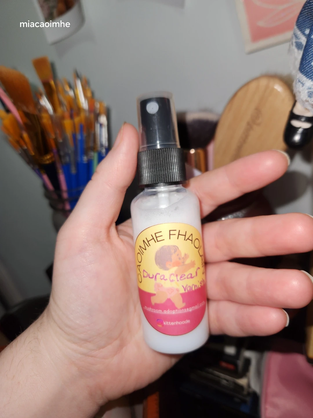 It's a mixture of DuraClear Americana Matte varnish, Reborn FX sealer and distilled water. This mix will leave a slightly glowy and soft matte finish to your doll. 2 or more layers may need to be used if the doll still feels tacky after curing.
