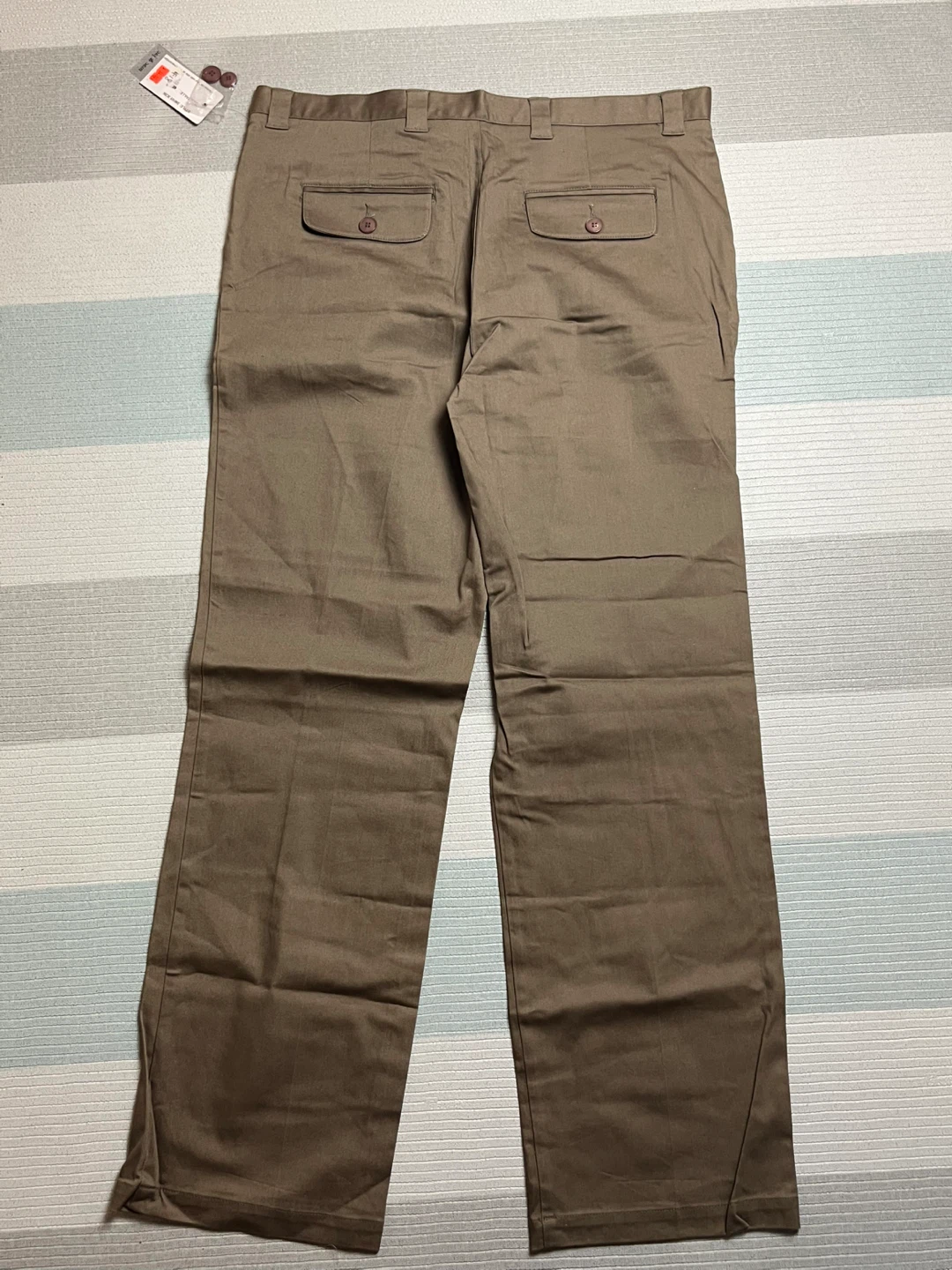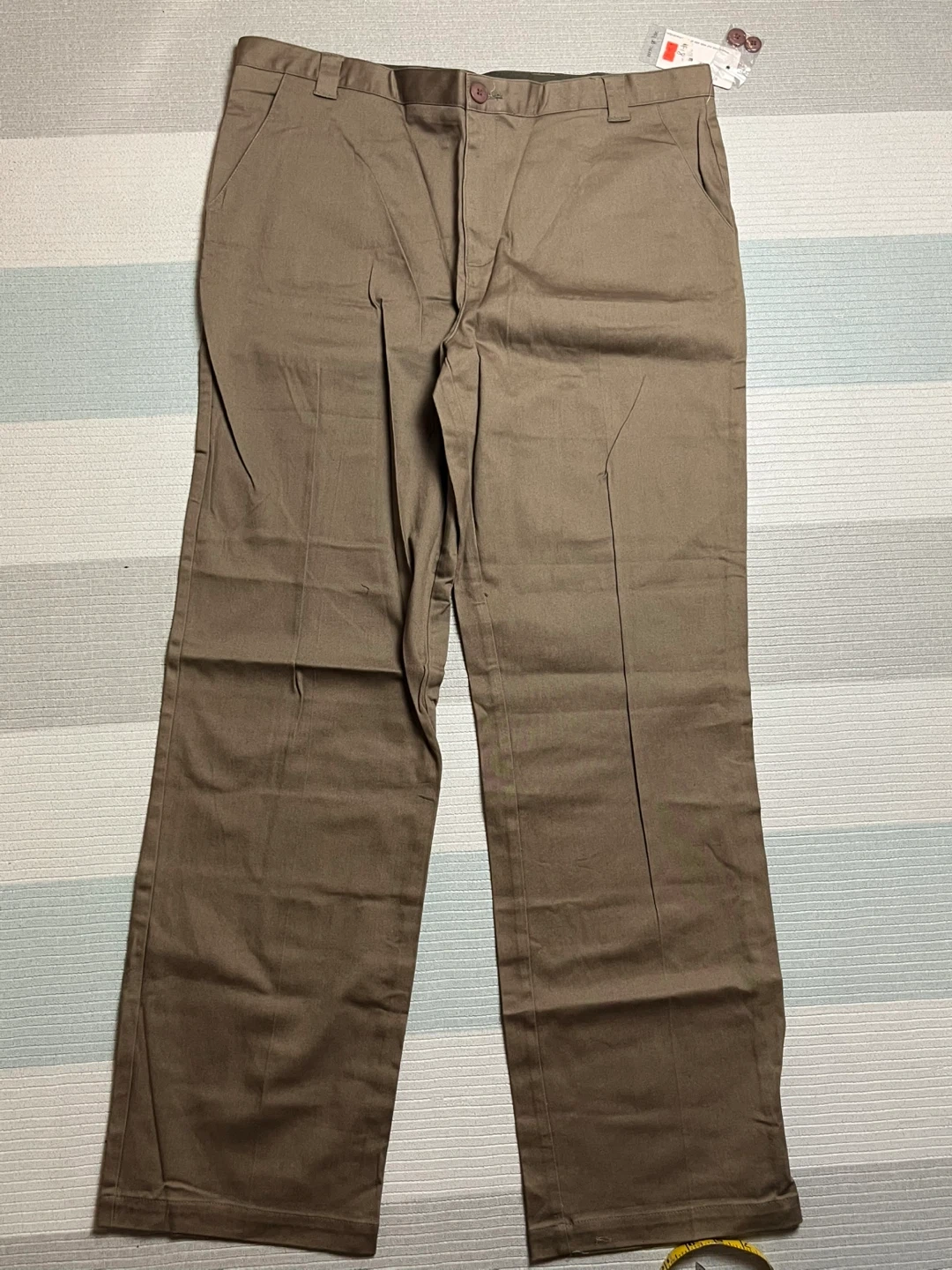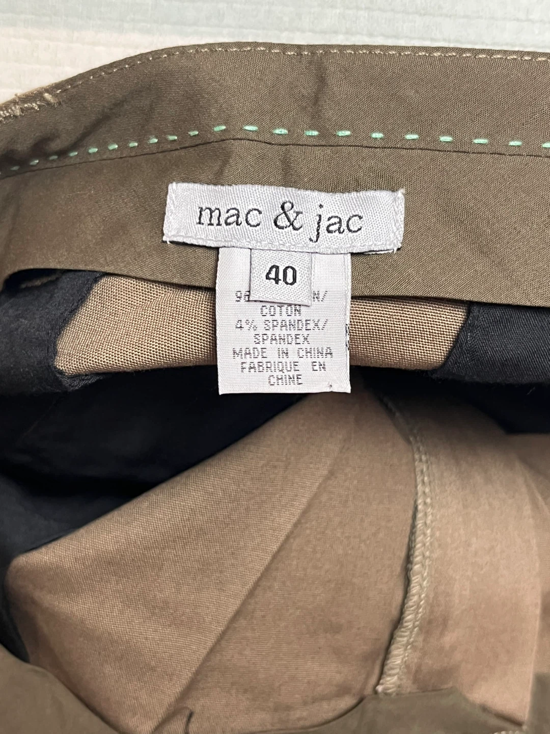 Selling a pair of Mac & Jac khaki pants in size 40. They're made of 96% cotton and 4% spandex. The colour is a classic khaki, perfect for any casual occasion!