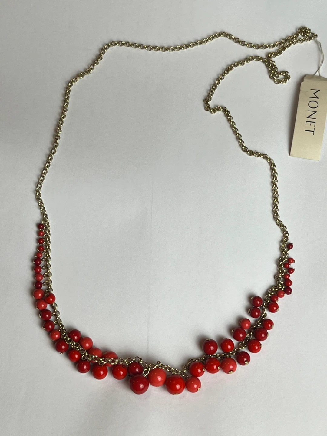 Selling a Monet necklace featuring a gold chain and lovely red beads. It's in great condition and ready to add a pop of colour to any outfit!