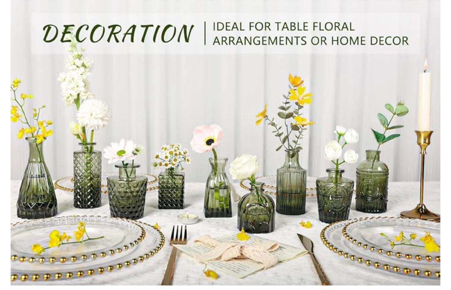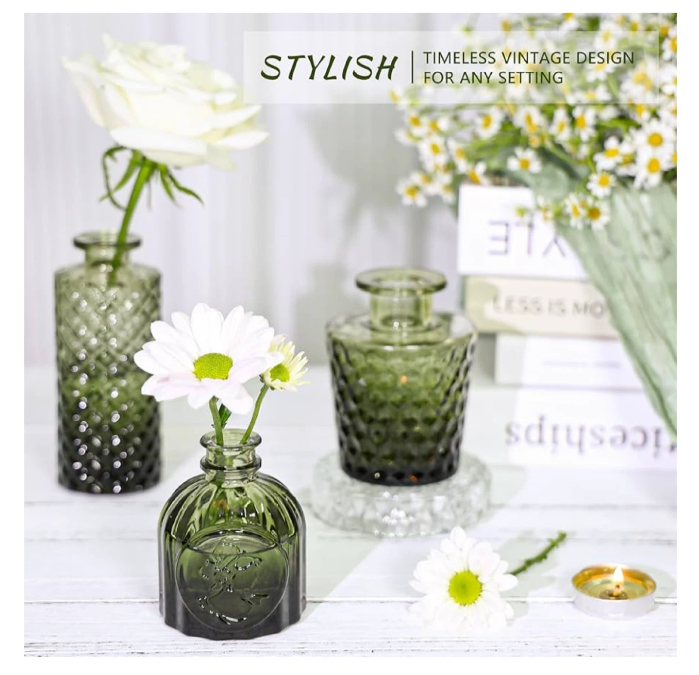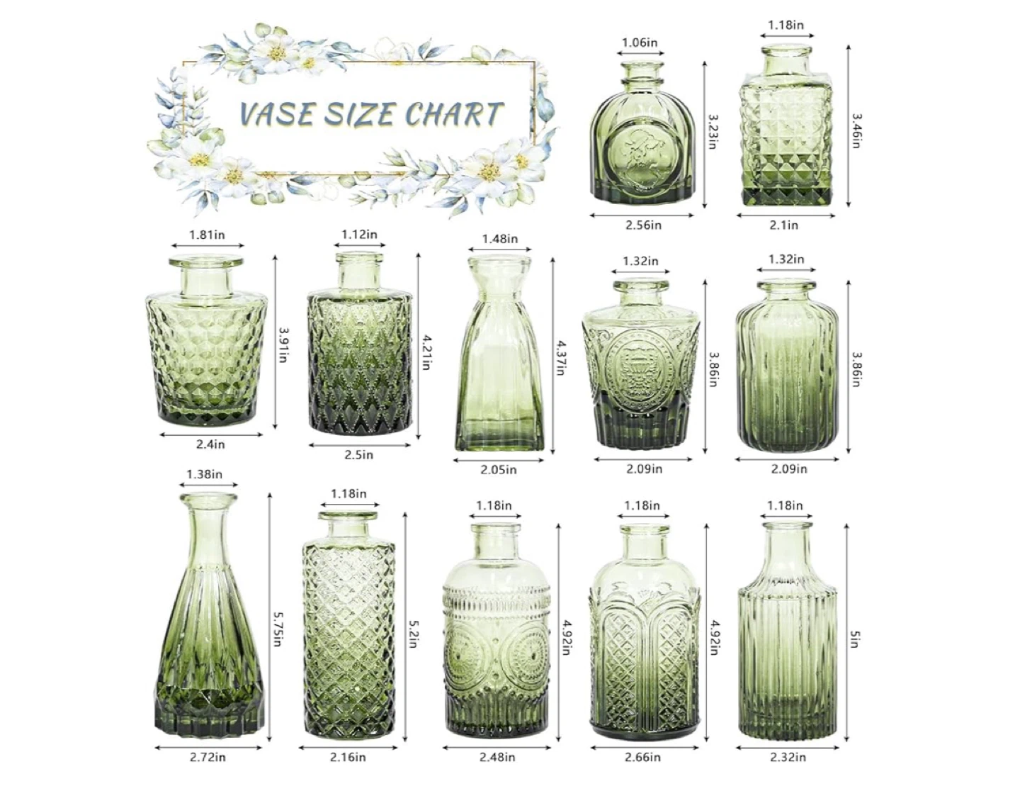 ELEGANT VINTAGE STYLE: This set includes 12 green glass bud vases, each adorned with delicate etched patterns for added charm. These flower vases boast a classy vintage design, suitable for any occasion, from casual to formal. Spruce up your window sill, dining table, or wedding reception with these beautiful vintage décor vases, creating an elegant centerpiece that will captivate all who see them.