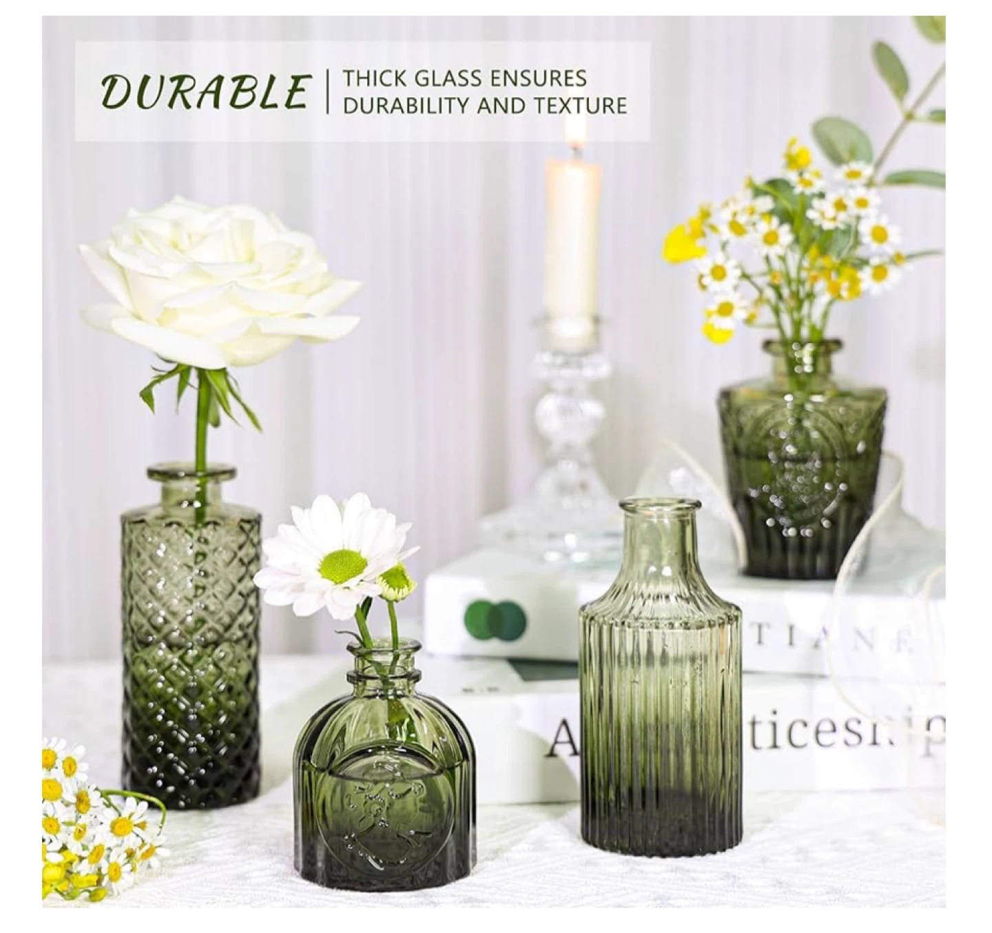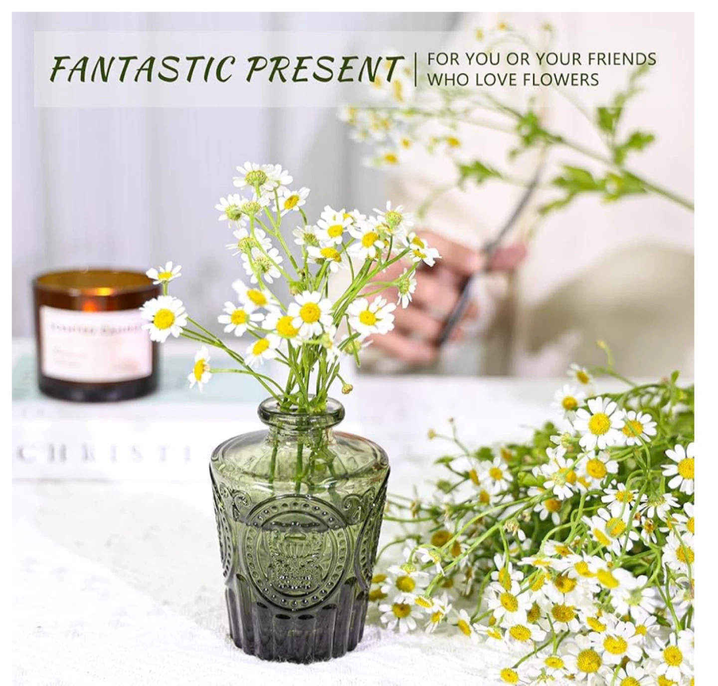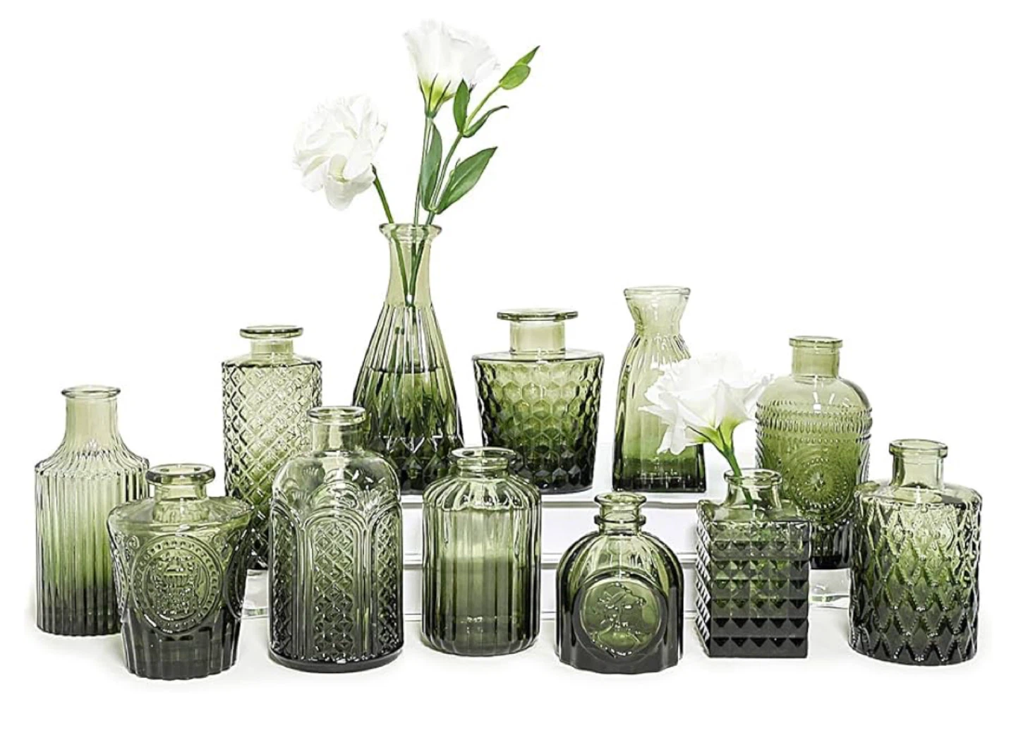 ELEGANT VINTAGE STYLE: This set includes 12 green glass bud vases, each adorned with delicate etched patterns for added charm. These flower vases boast a classy vintage design, suitable for any occasion, from casual to formal. Spruce up your window sill, dining table, or wedding reception with these beautiful vintage décor vases, creating an elegant centerpiece that will captivate all who see them.