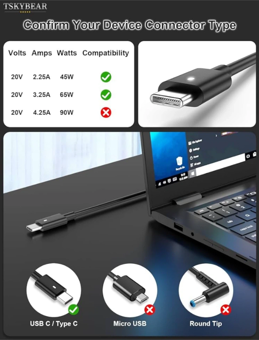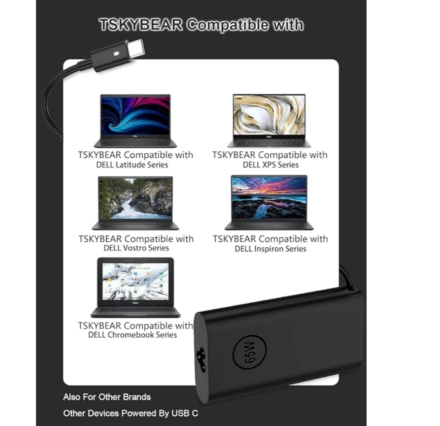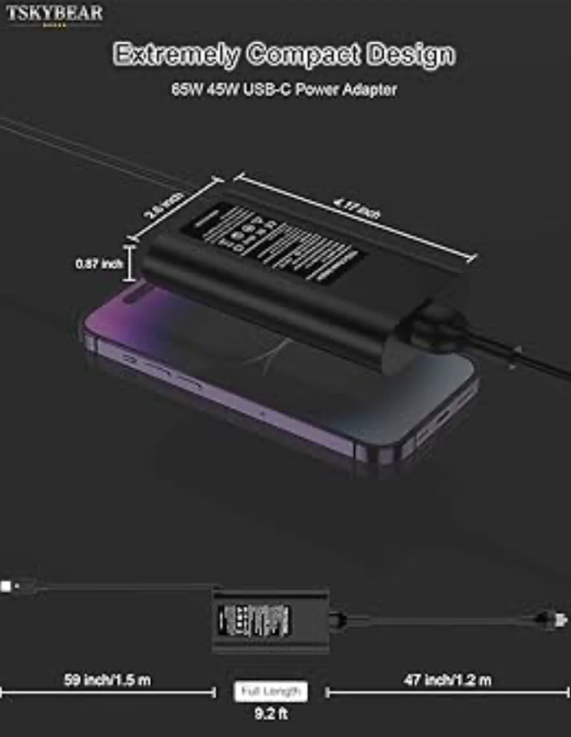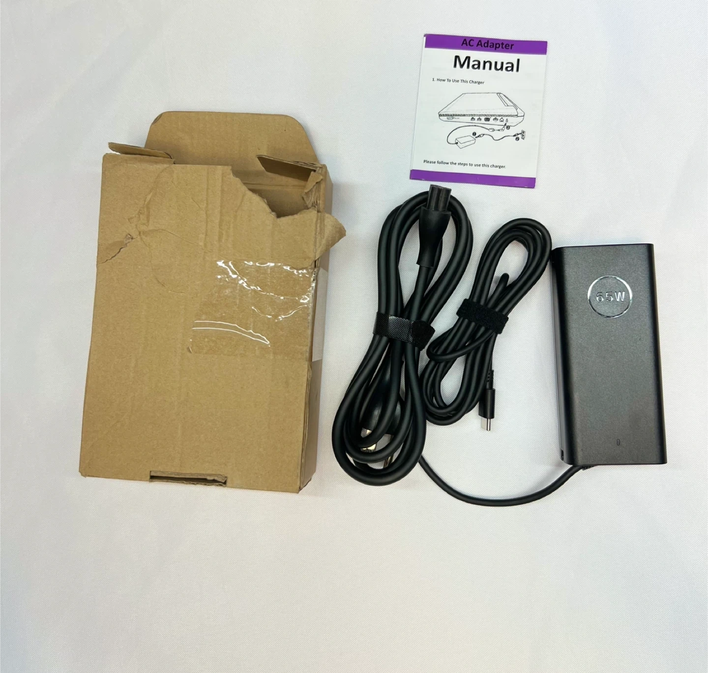 Selling a TSKYBEAR 65W Type-C power adapter. It is compatible with devices requiring 20V 3.25A or 45W. It also comes with the original box and manual