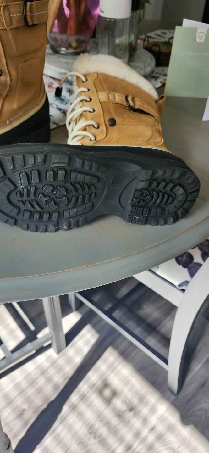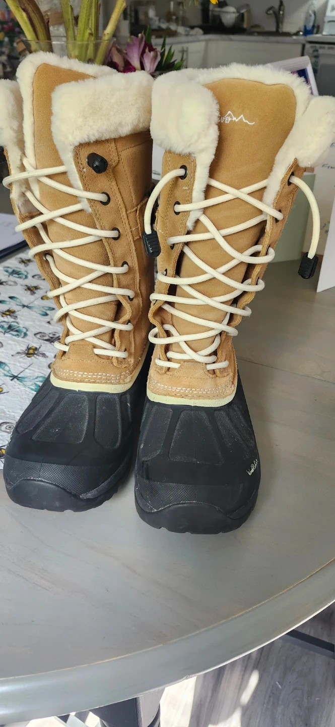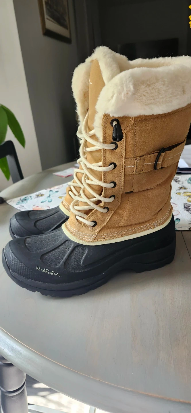 Cozy Ladies WindRiver snow boots, They are a women's size 9 and feature a tan upper with a black base and faux fur trim. Only worn a few times as I have limited use of hands to pull them on.