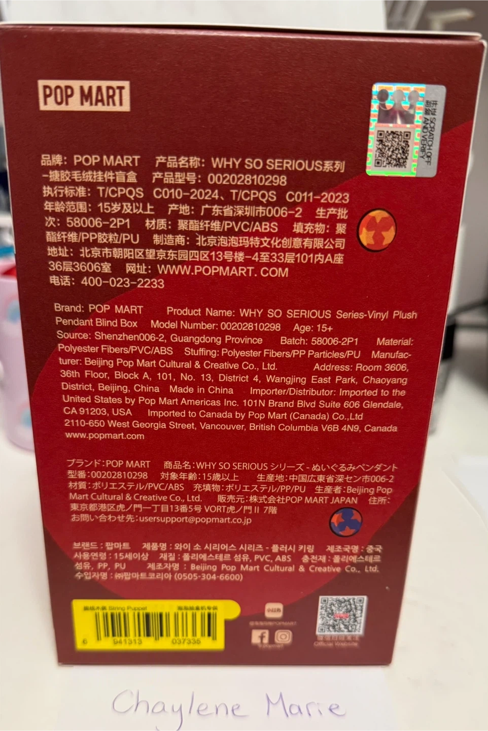Selling a POP MART Why So Serious Series-Vinyl Plush Pendant Blind Box. It's made of polyester fiber and PP particles/PU. Great for collectors!