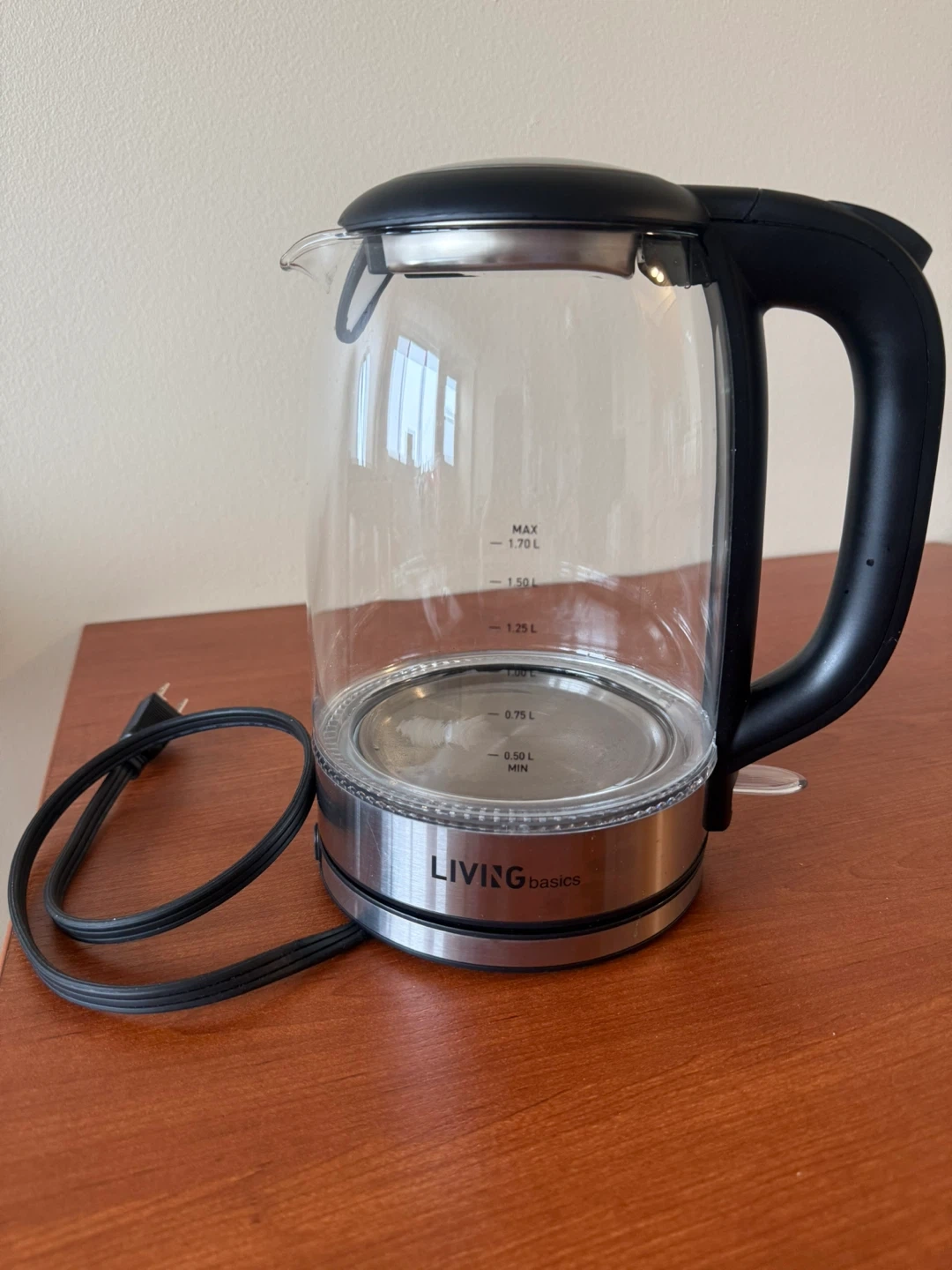 Selling a Living Basics glass electric kettle. It has a capacity up to 1.70L. Perfect for making tea or coffee!