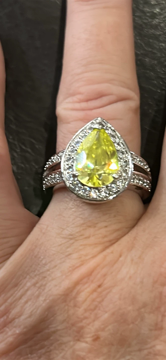 This is a beautiful silver ring featuring a vibrant yellow stone. The band is marked with '925', indicating it's made of sterling silver. It's in great condition and ready to add a pop of colour to your jewellery collection