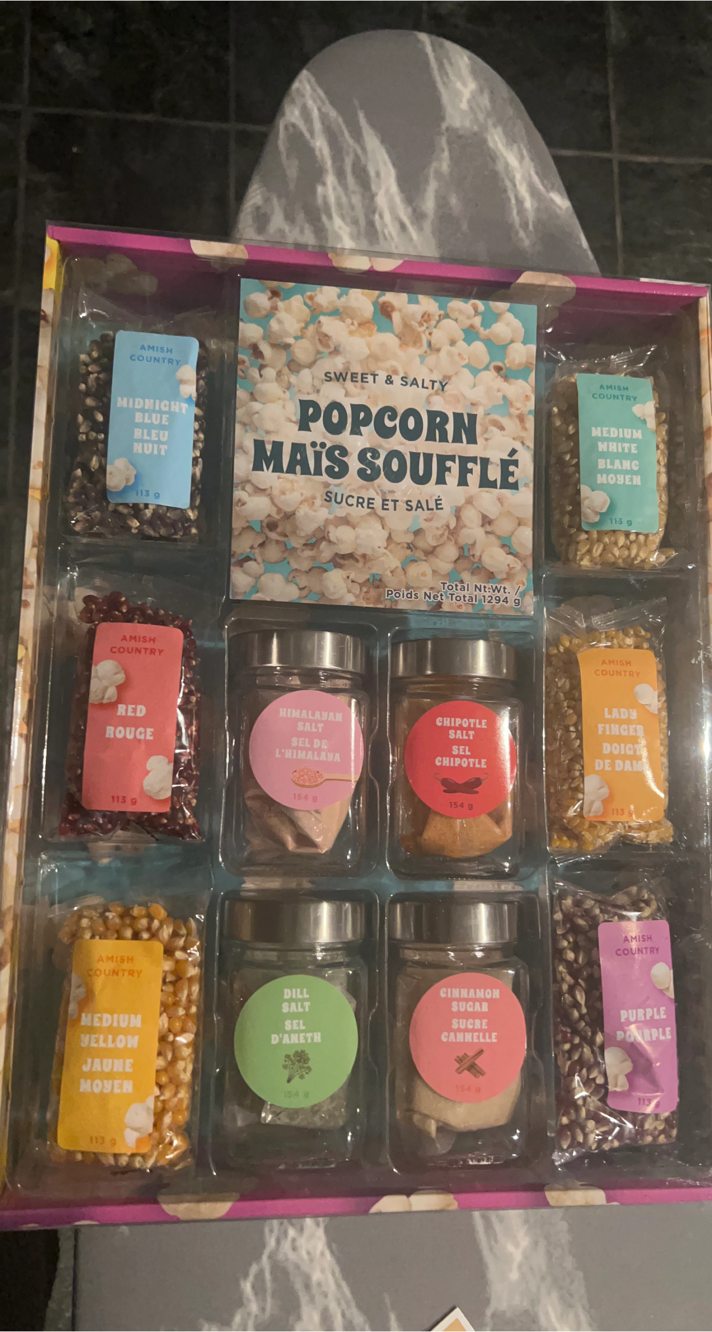 Selling an Amish Country popcorn variety pack! It includes a selection of different popcorn kernels and flavored salts.