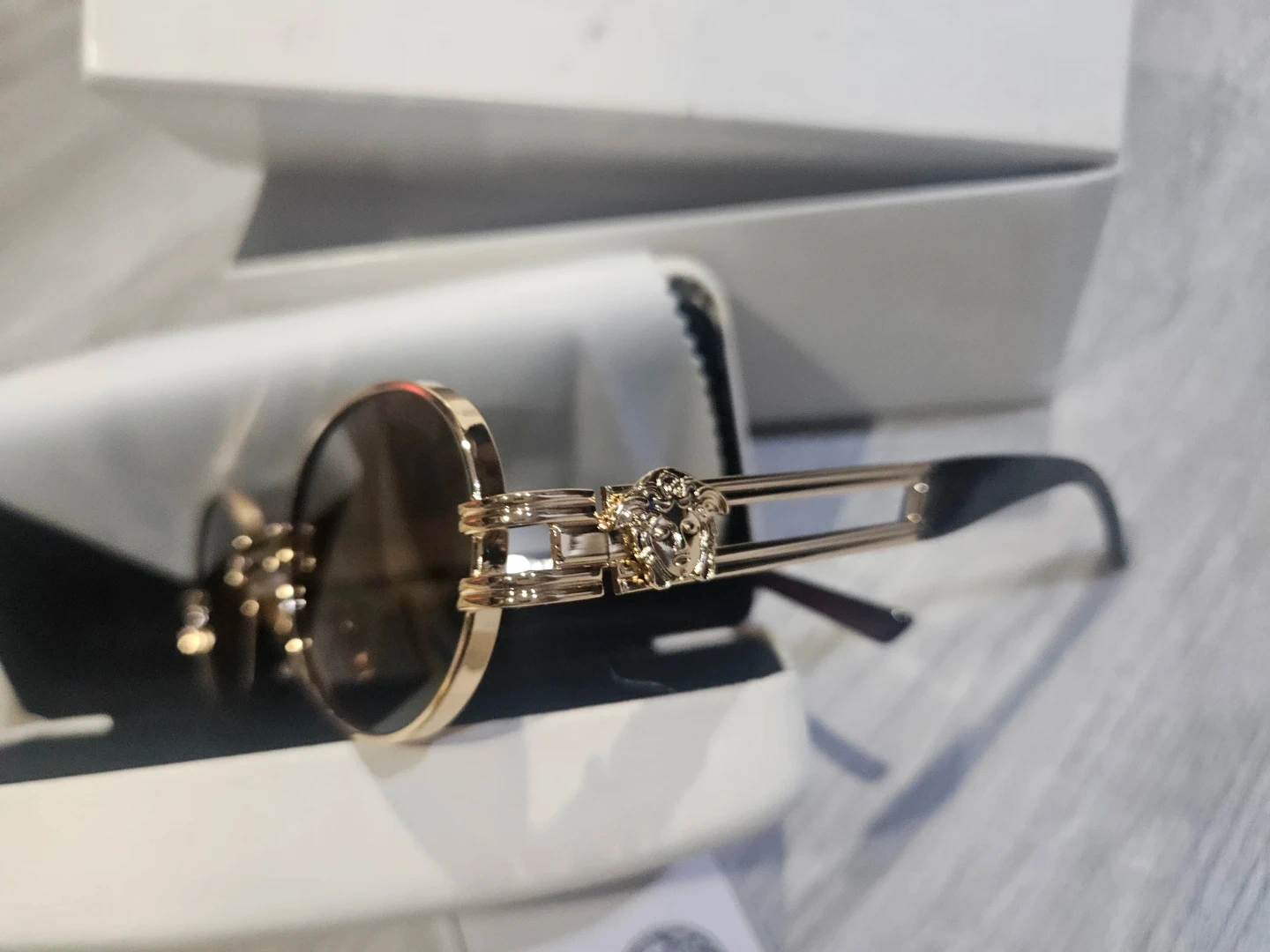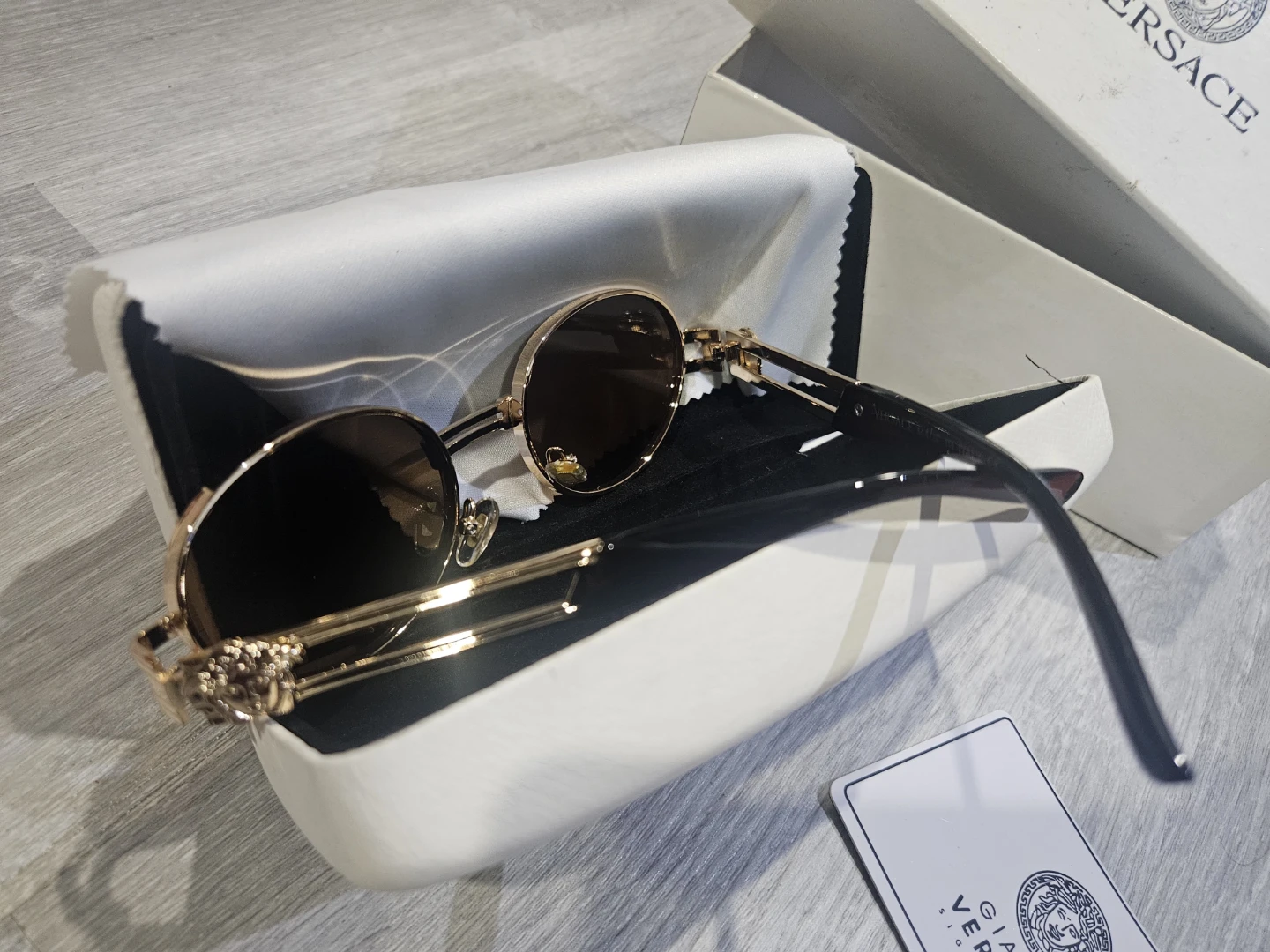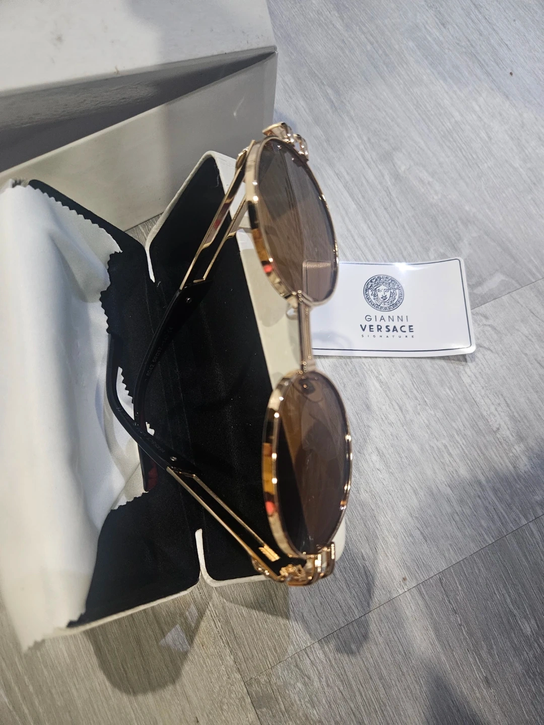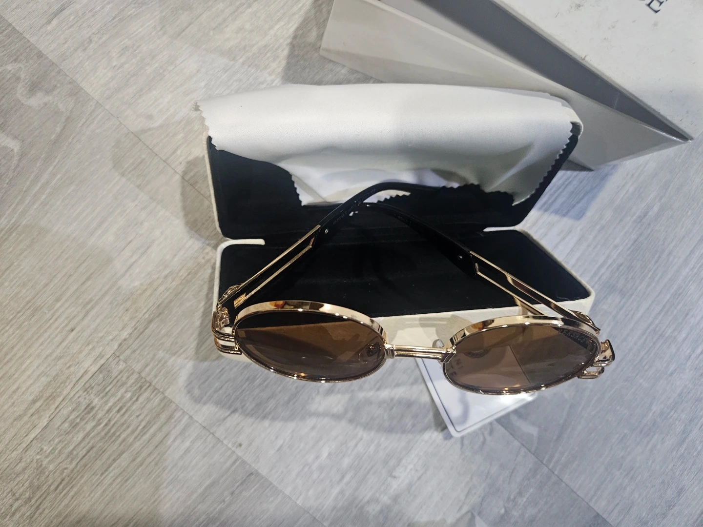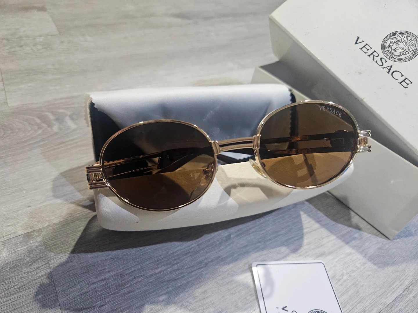 These Versace sunglasses feature a stylish round frame with gold accents. They come with the original box and a cleaning cloth. Perfect for adding a touch of luxury to your look!
