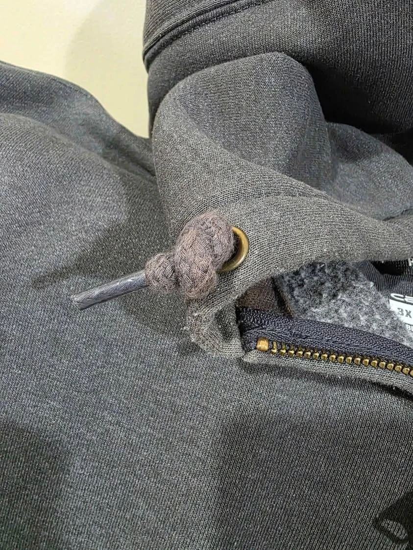 The only minor issue is that there is just a little bit of fading on the hoodie strings and on the seem on the bottom.