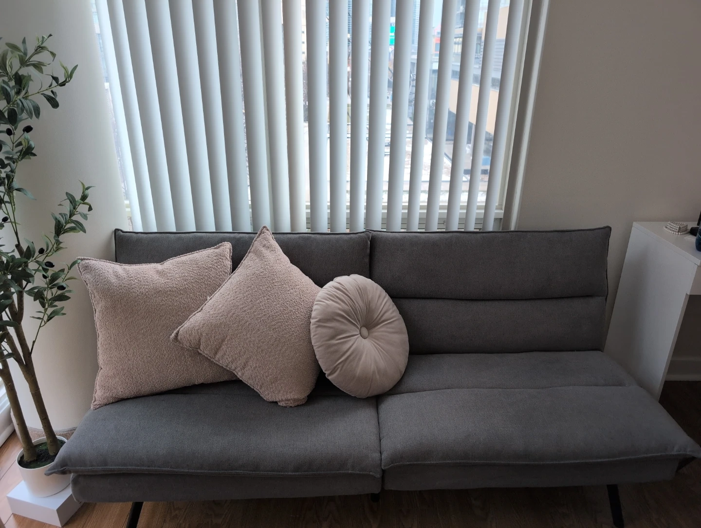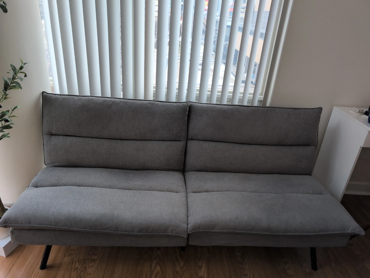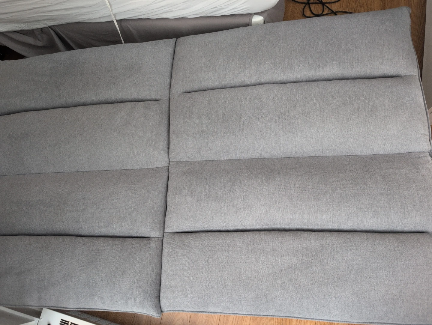 Pillow top Sofa / Couch that converts to bed or day lounger. - Excellent condition - Light Grey - 3 settings (fully upright - half up - fully down) - Easily converts into a bed - ideal for guests or small spaces FLAT (As Bed) 71" x 43" x 15" UPRIGHT (As Couch) 71" x 34" x 32" Bought few years ago. No damage no stains No Pets / No Smoking / No Kids (Cushions NOT included) Pick up at Spadina / Bremner Can offer delivery for $50 if needed.