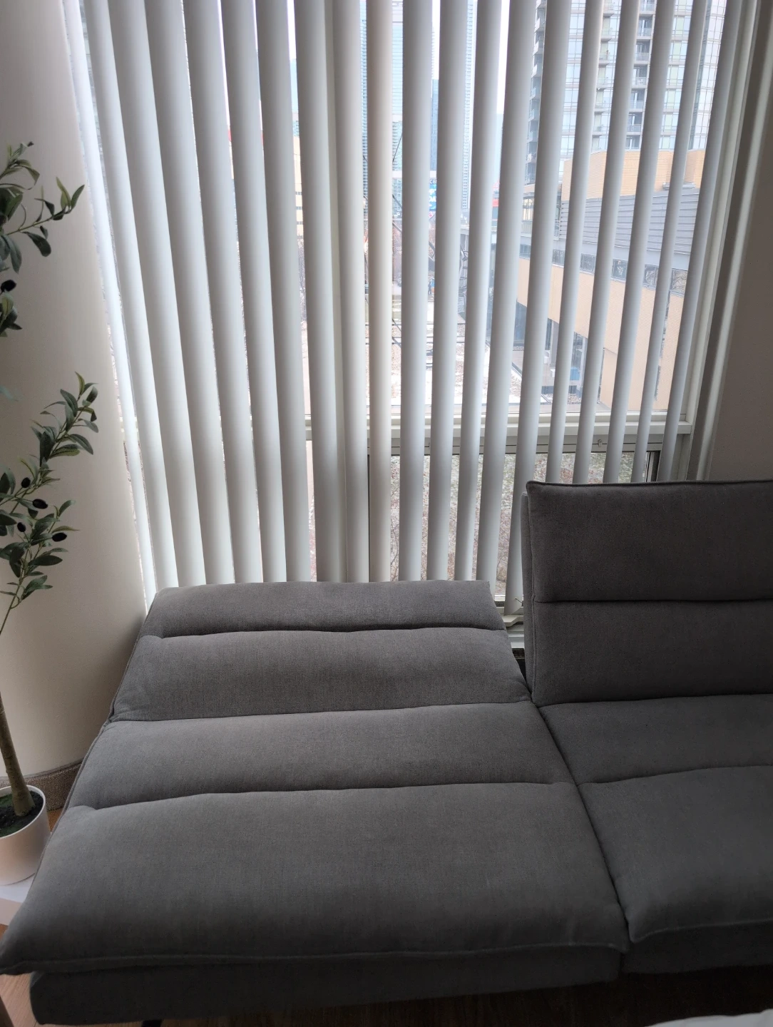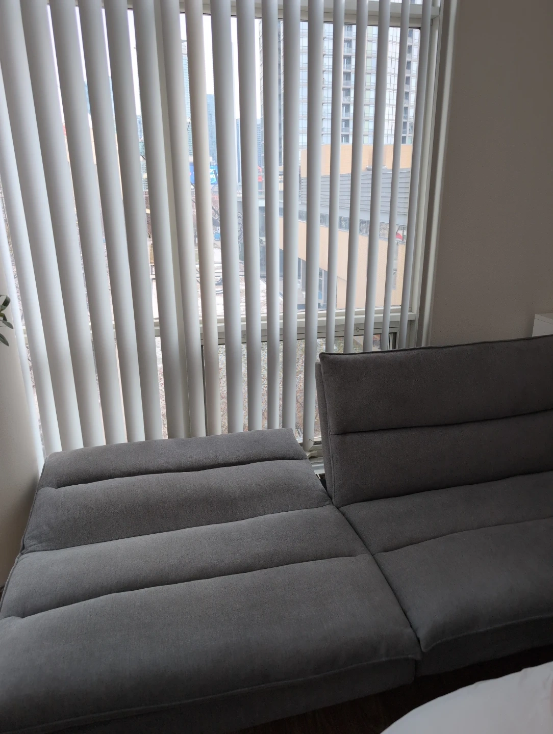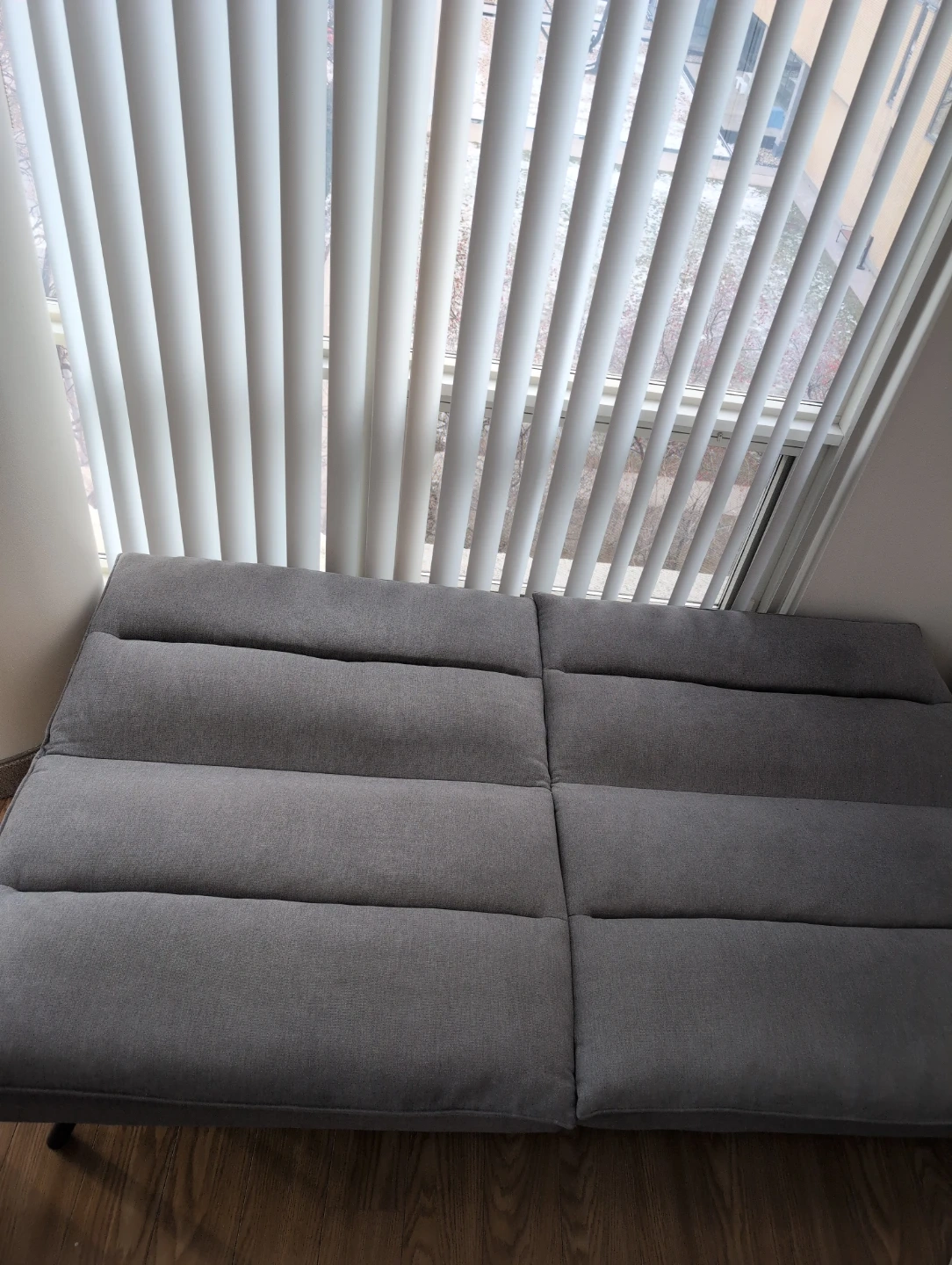 Pillow top Sofa / Couch that converts to bed or day lounger. - Excellent condition - Light Grey - 3 settings (fully upright - half up - fully down) - Easily converts into a bed - ideal for guests or small spaces FLAT (As Bed) 71" x 43" x 15" UPRIGHT (As Couch) 71" x 34" x 32" Bought few years ago. No damage no stains No Pets / No Smoking / No Kids (Cushions NOT included) Pick up at Spadina / Bremner Can offer delivery for $50 if needed.