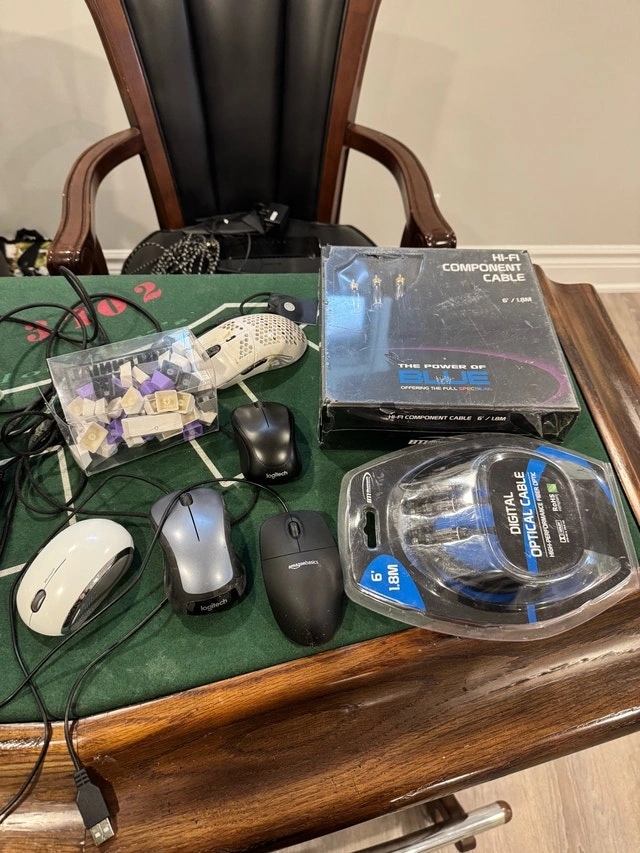 Bag full of electronics take it all $60 everything in photos and I’ll also include a hyperx cloud headset and model o mouse that work just have some tape Lot includes Corsair k70 Logitech and Amazon Mouses Wireless speaker Wireless charger D link router Asus wireless adapter Brand new digital optical and component cables and more Take it all $60 need gone today thanks