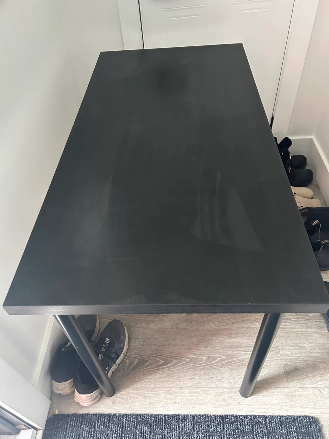 Selling a black desk in good condition. It's a simple and functional piece, perfect for a home office or study space. The desk has a sleek, modern look with a smooth surface and sturdy legs.