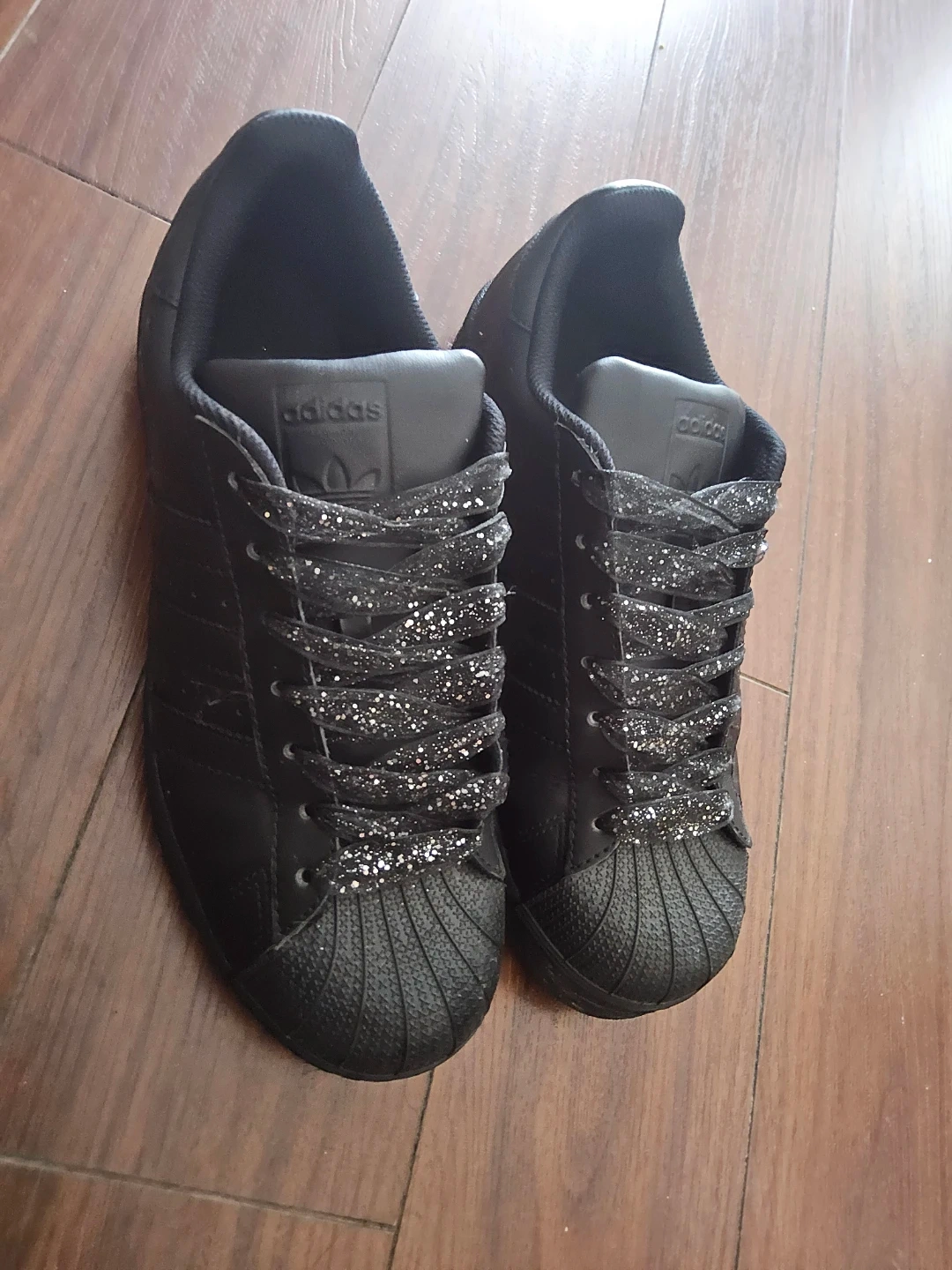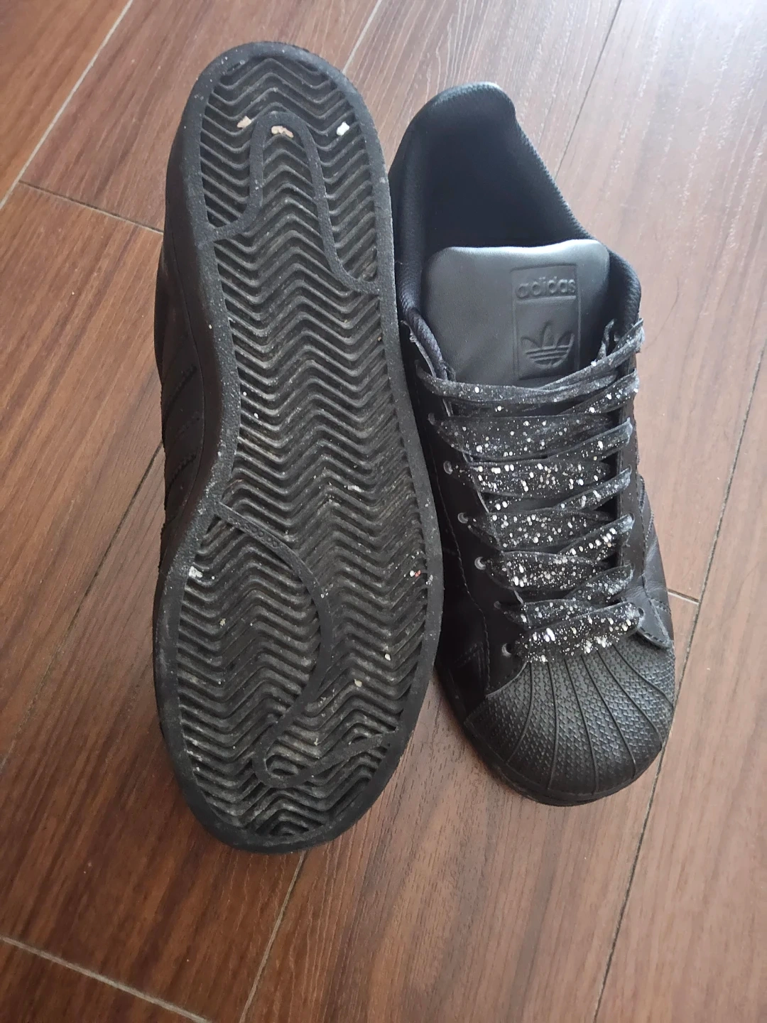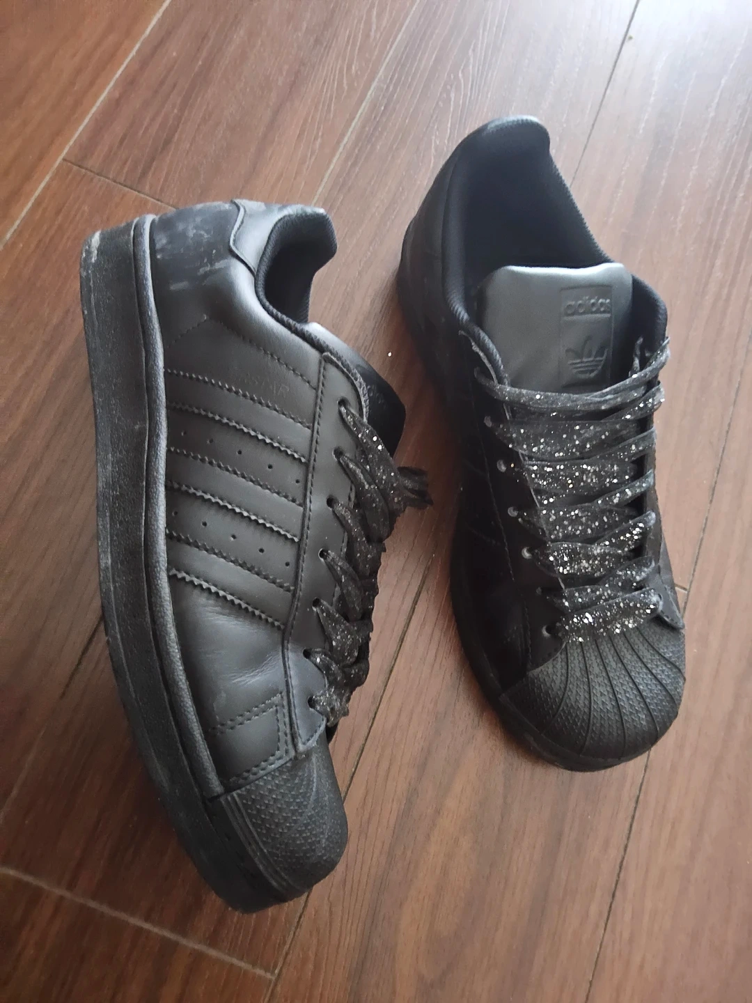 Selling a pair of Unisex Adidas Superstar shoes in matte black with glittery laces.