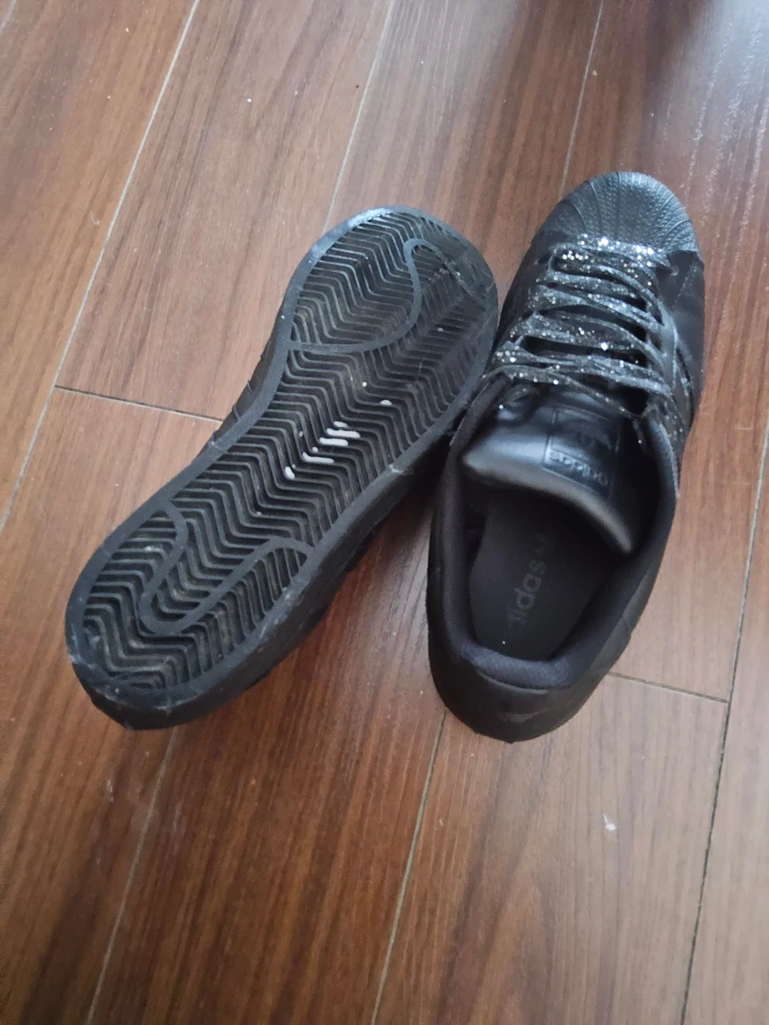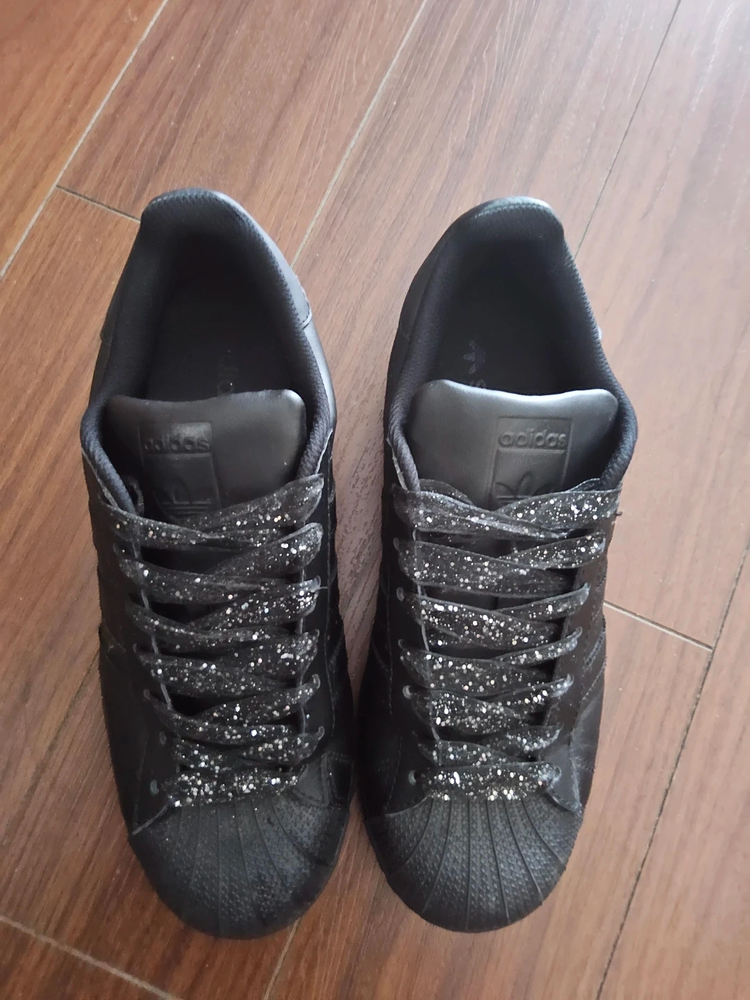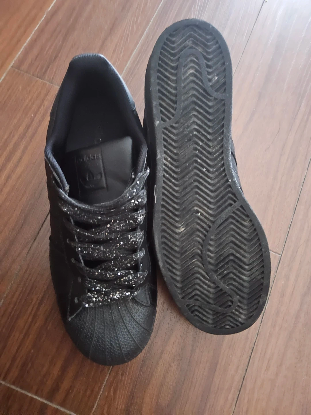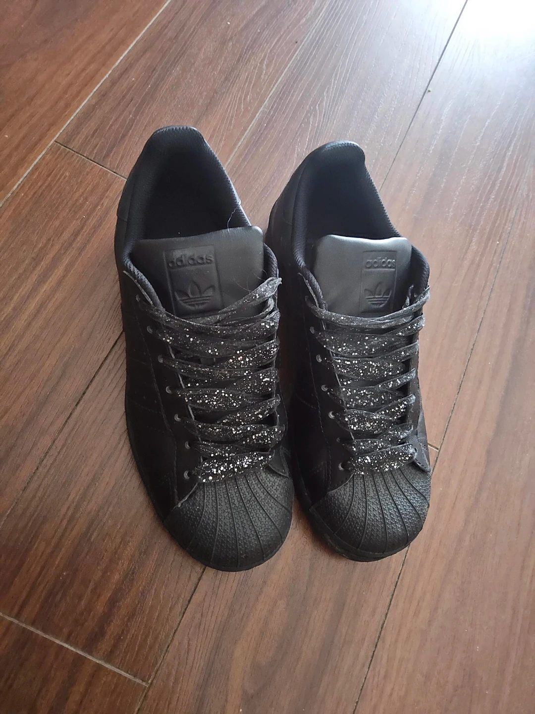 Selling a pair of Unisex Adidas Superstar shoes in matte black with glittery laces.