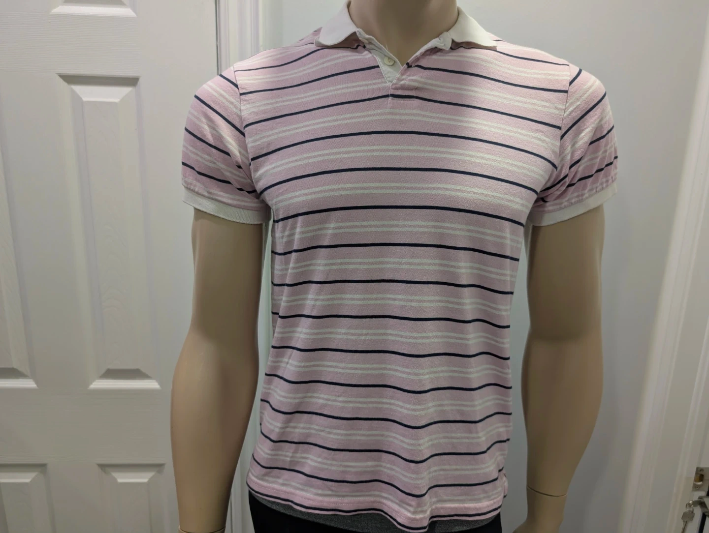 This is a very gently used men's Old Navy polo shirt, featuring a stylish striped pattern in pink, white, and navy, and it's a size small. Since it's gently used, it comes with a certain charm that only a well-loved piece can offer!