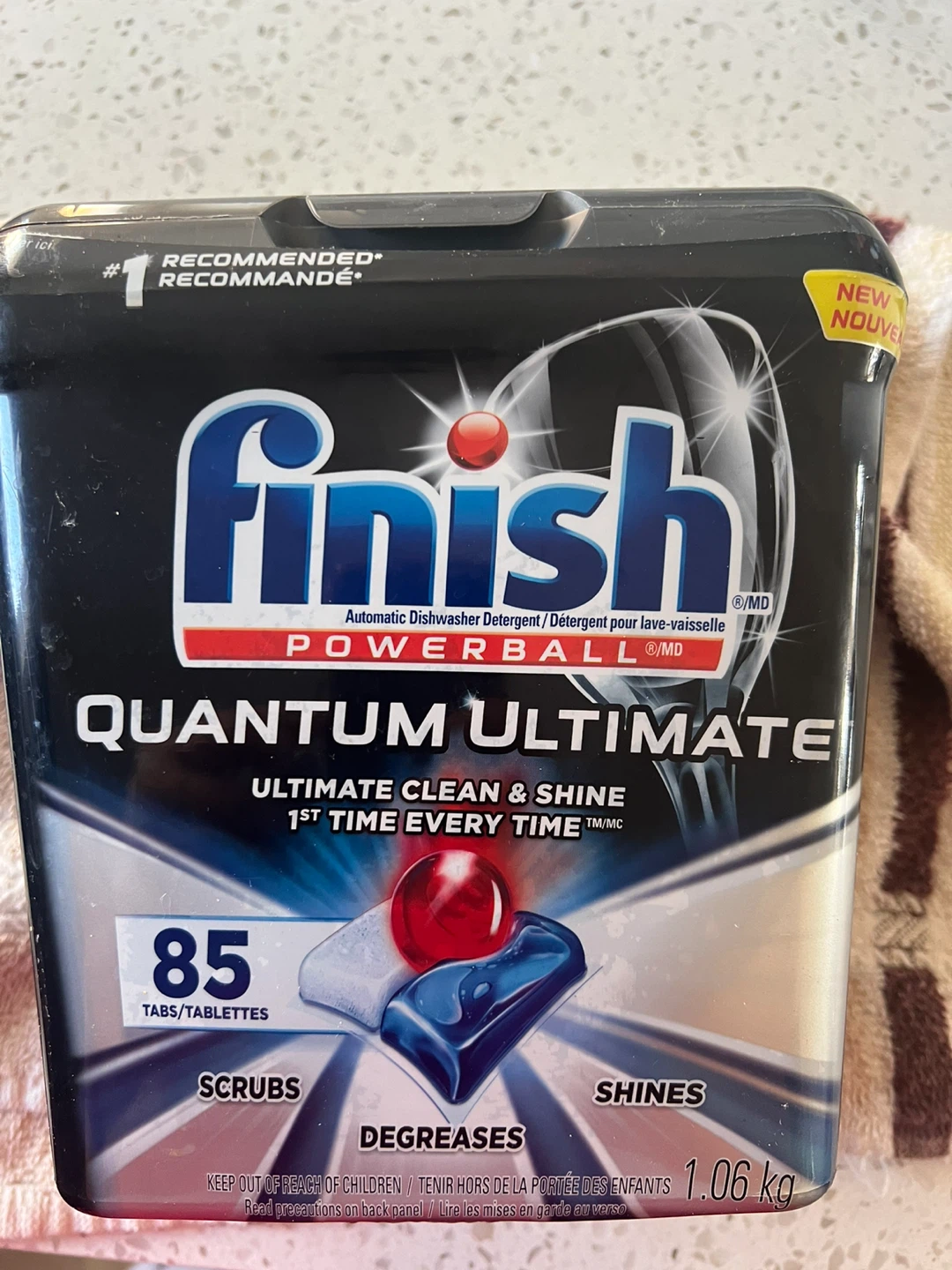 Selling a container of Finish Quantum Ultimate dishwasher detergent tabs. This container has 85 tabs. They provide ultimate clean and shine, first time every time!