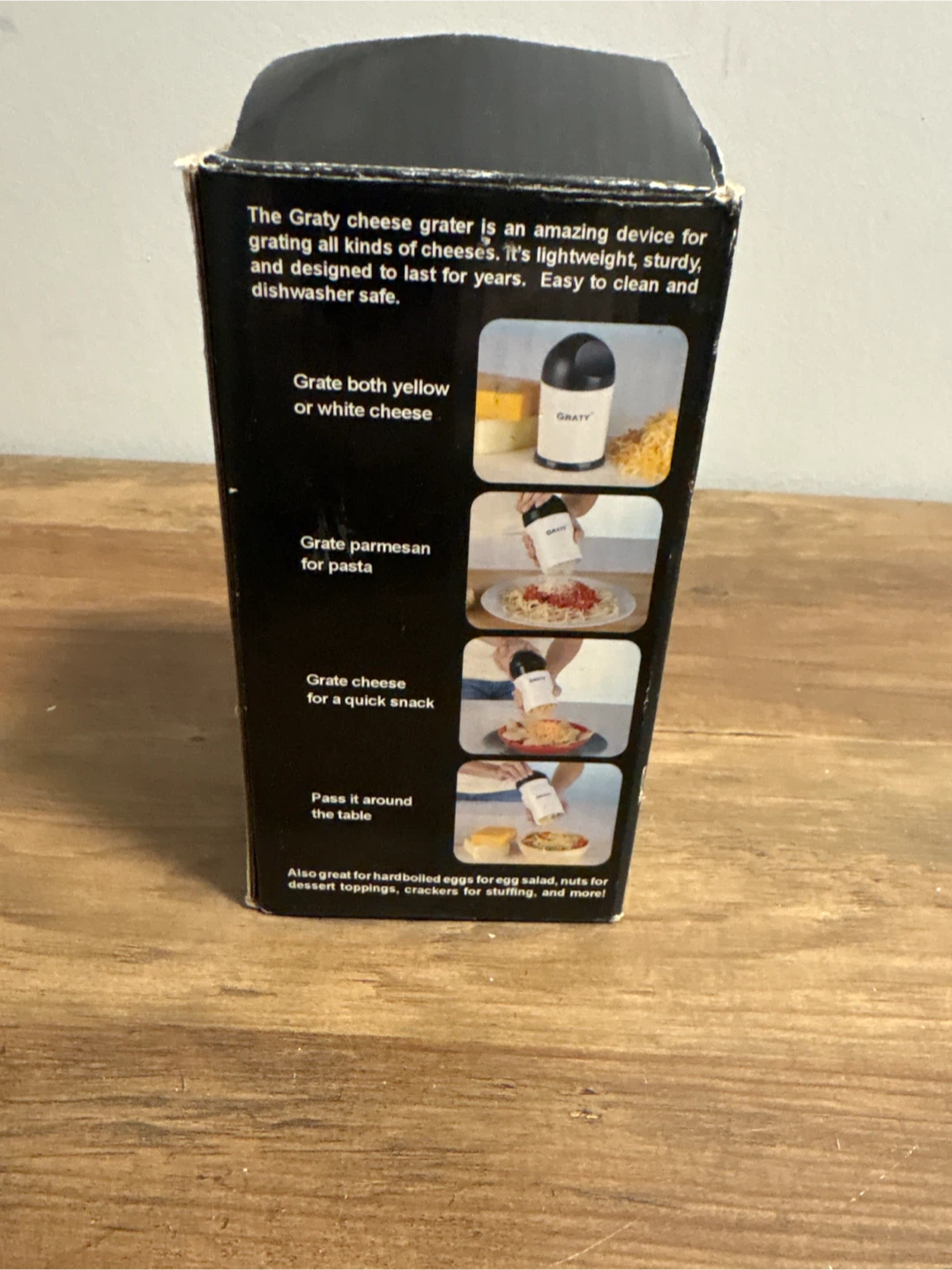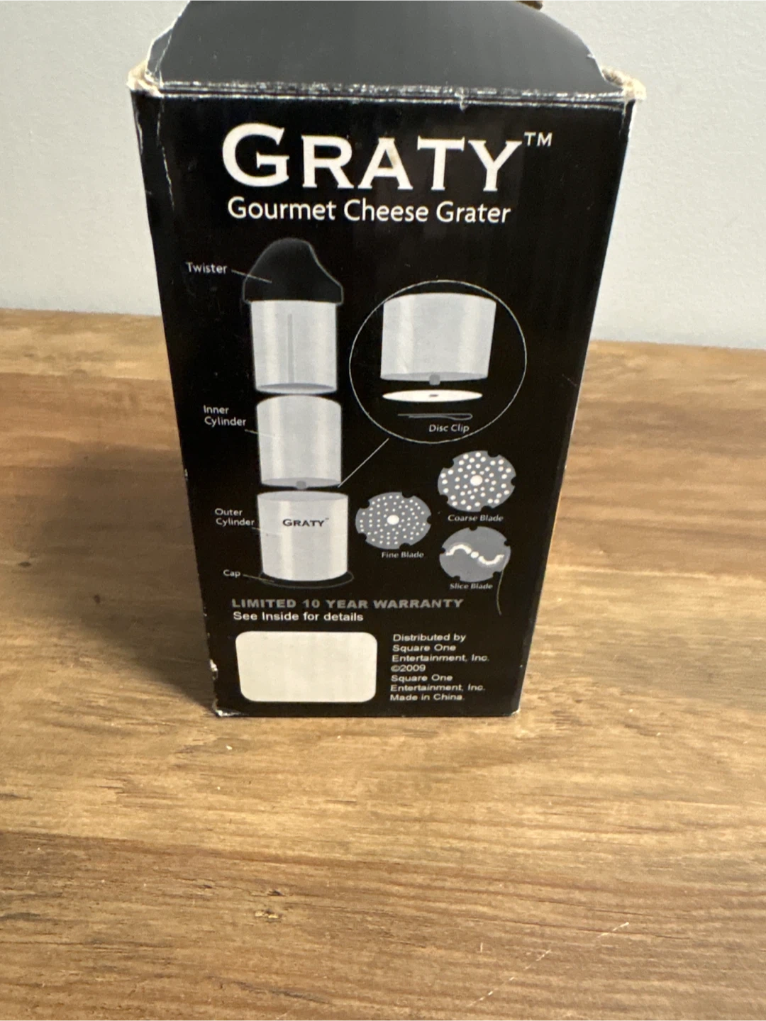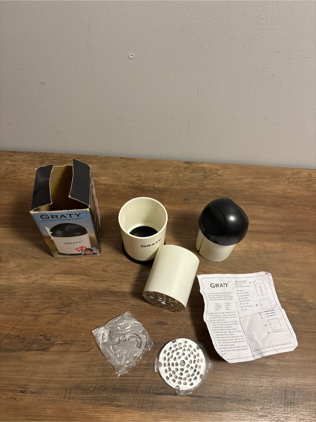 Looking to grate some cheese? This Graty cheese grater is in great shape and comes with the box! It's lightweight, sturdy, and designed to last for years, plus it's easy to clean and dishwasher safe. It can grate both yellow or white cheese, parmesan for pasta, or cheese for a quick snack. Also great for hardboiled eggs for egg salad, nuts for dessert toppings, crackers for salads, and more! Included are the inner cylinder, outer cylinder, cap, coarse blade, fine blade, and slice blade