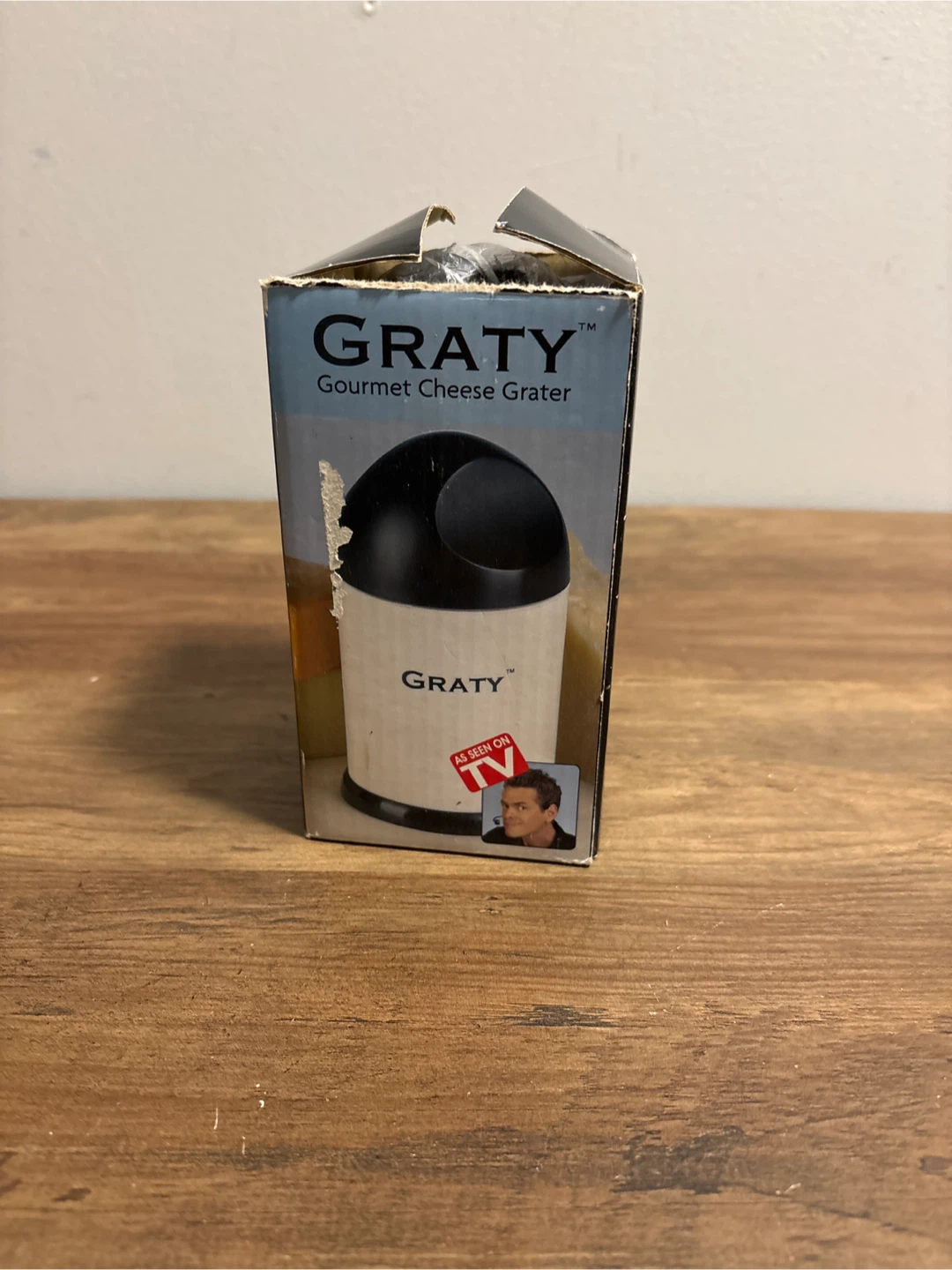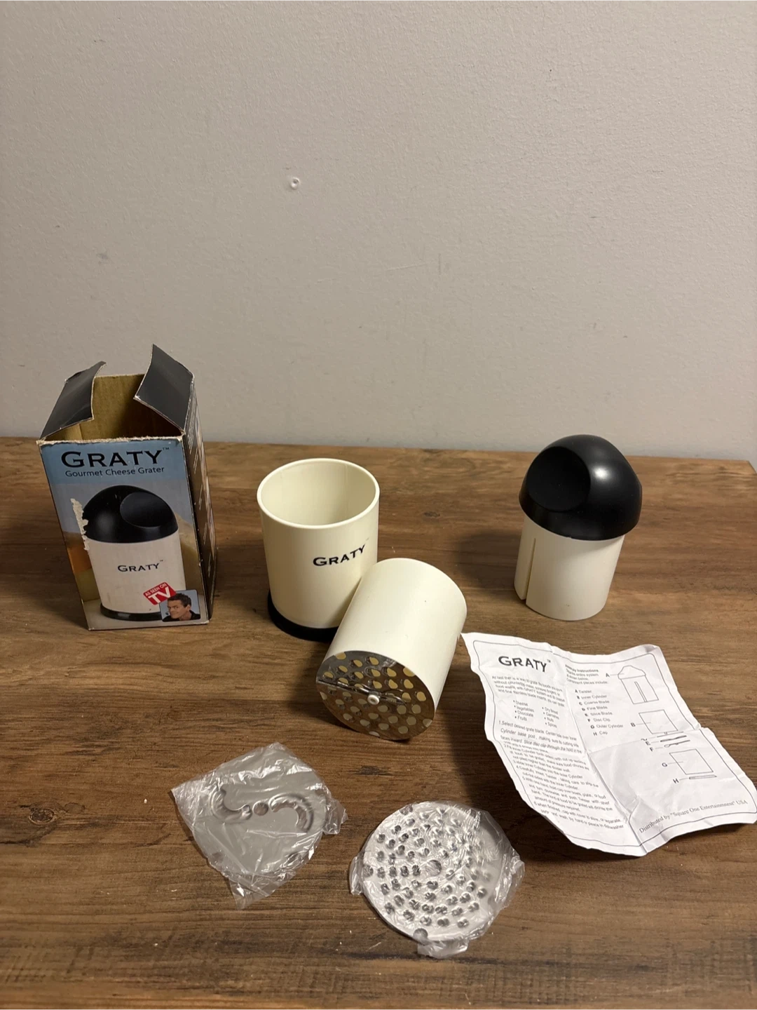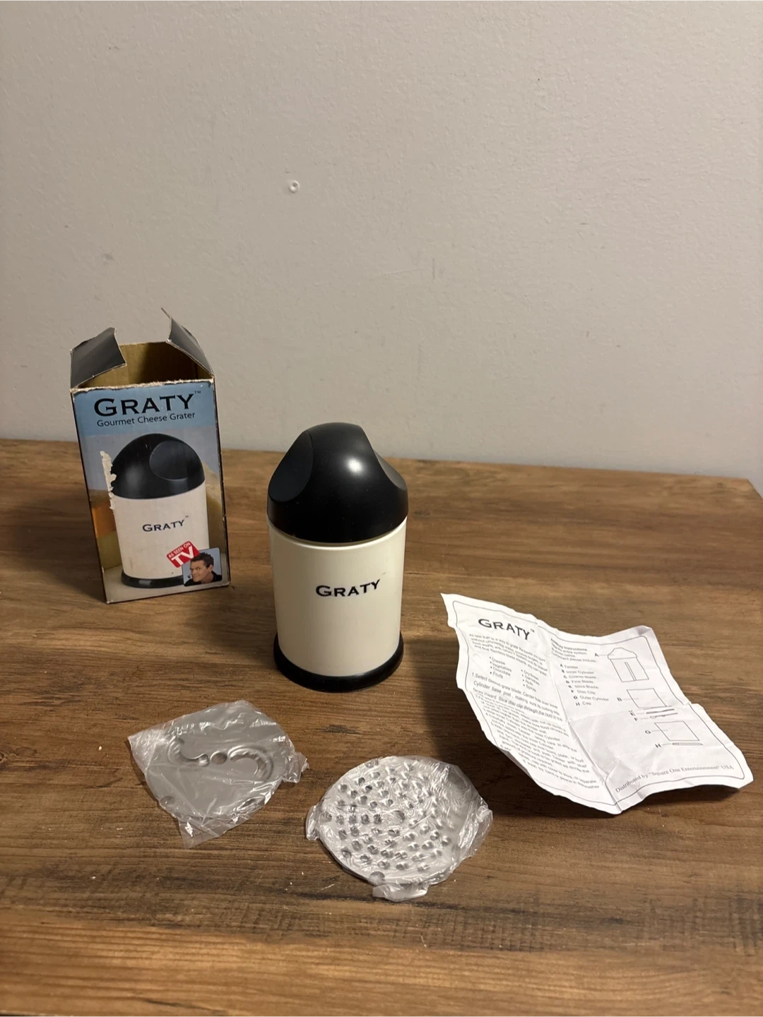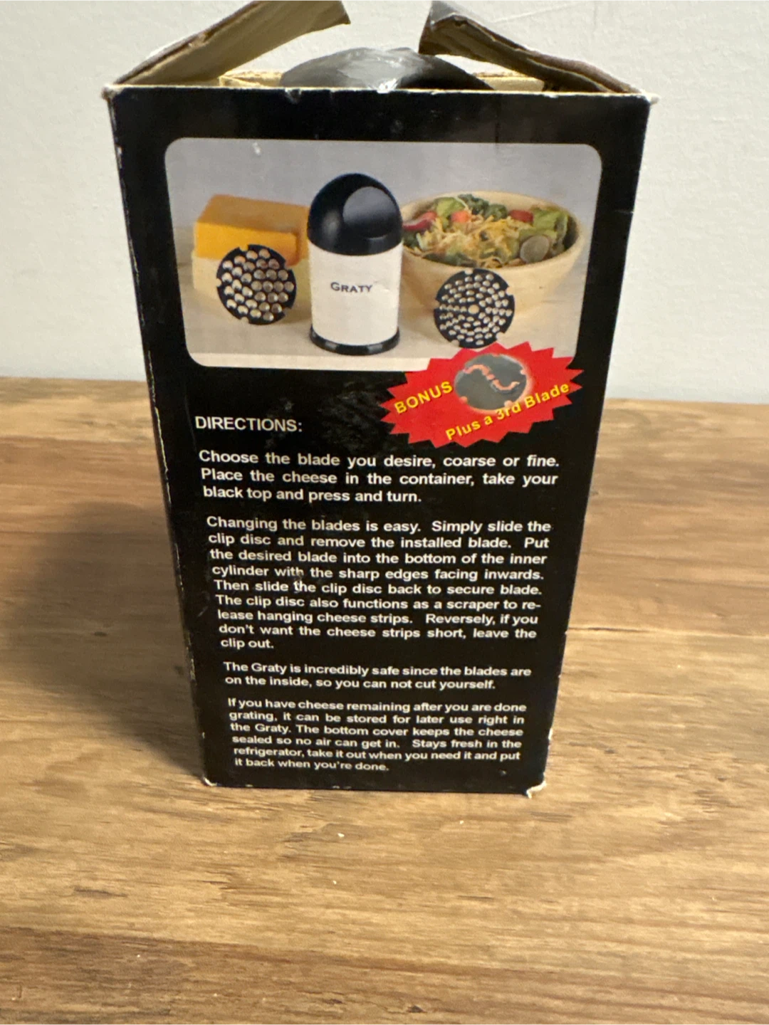 Looking to grate some cheese? This Graty cheese grater is in great shape and comes with the box! It's lightweight, sturdy, and designed to last for years, plus it's easy to clean and dishwasher safe. It can grate both yellow or white cheese, parmesan for pasta, or cheese for a quick snack. Also great for hardboiled eggs for egg salad, nuts for dessert toppings, crackers for salads, and more! Included are the inner cylinder, outer cylinder, cap, coarse blade, fine blade, and slice blade