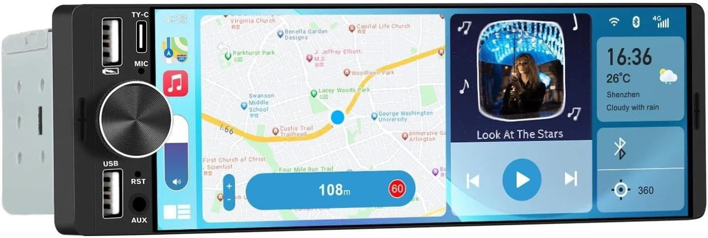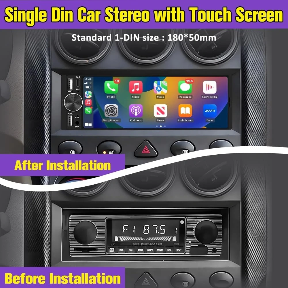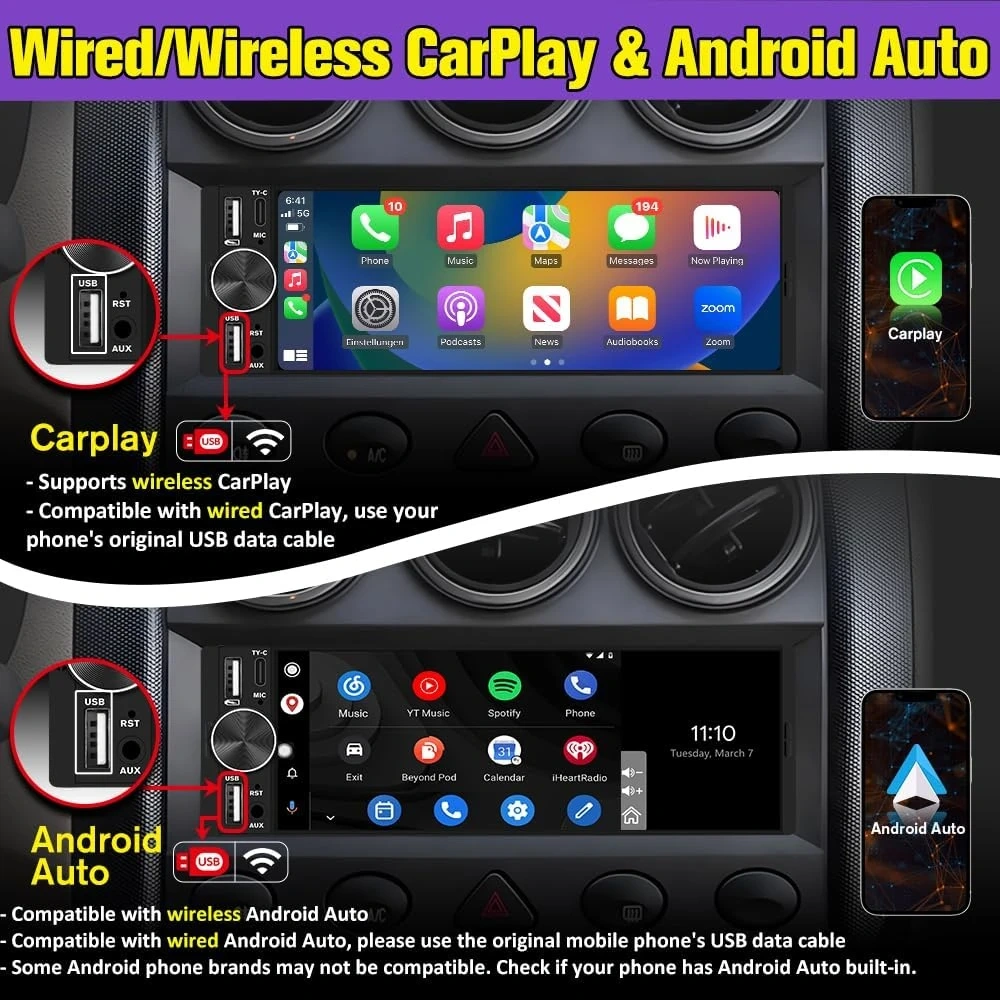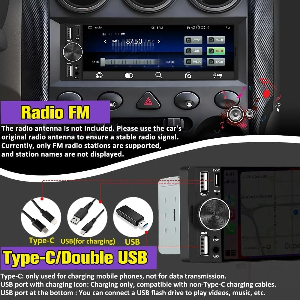 【Dual USB Ports for Charging & Multimedia】 This single din head unit is equipped with two dedicated USB ports to enhance convenience and functionality. One USB port is designed exclusively for charging, ensuring your smartphone stays powered during long trips. The second USB port supports multimedia playback via USB flash drives and also enables wired CarPlay and Android Auto, offering a stable connection option for navigation, music, and apps when you prefer a cable over wireless pairing.