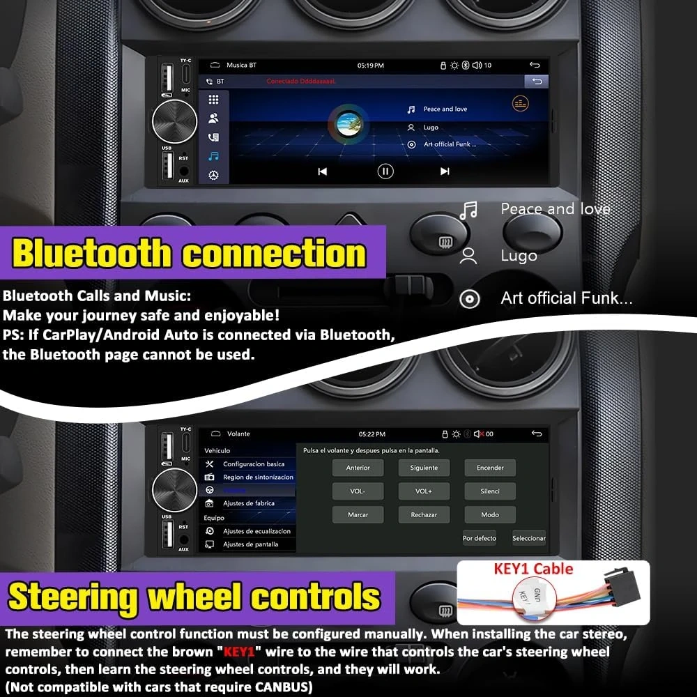 【Multiple Control Methods for Added Flexibility】 Operate the single DIN stereo through the responsive touchscreen, the integrated rotary volume knob, or your vehicle’s steering wheel controls. For cars that support wired steering functions, simply connect the factory control wires to the KEY1/KEY2 ports on the head unit harness.