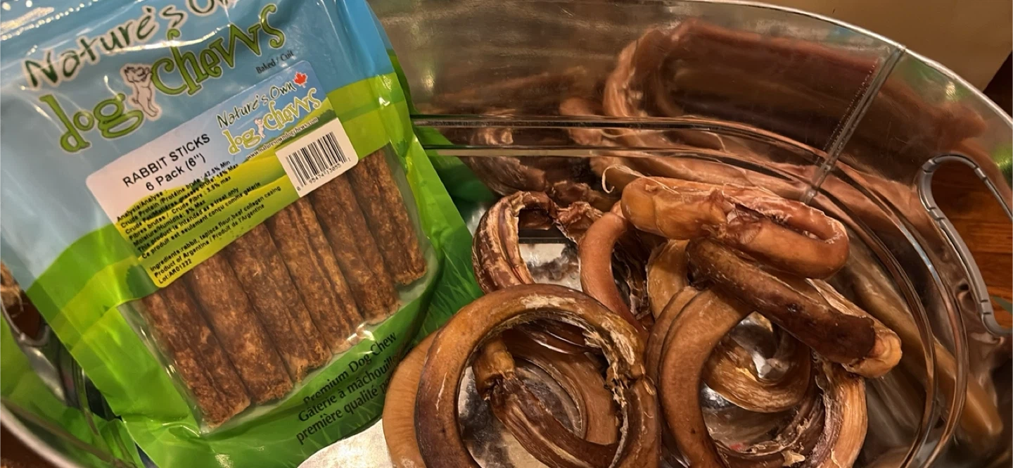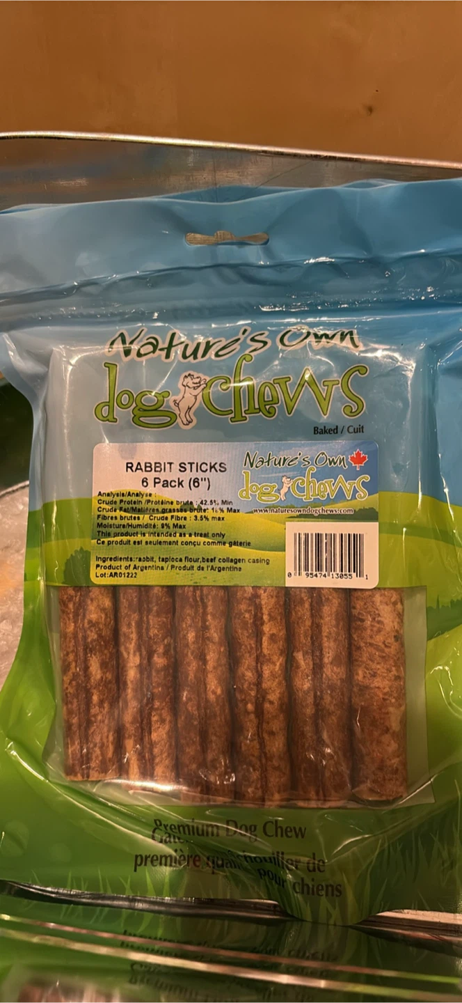 Bully sticks are treats that keeps you dogs occupied for about an hour. Rabbits chews are regular treats.