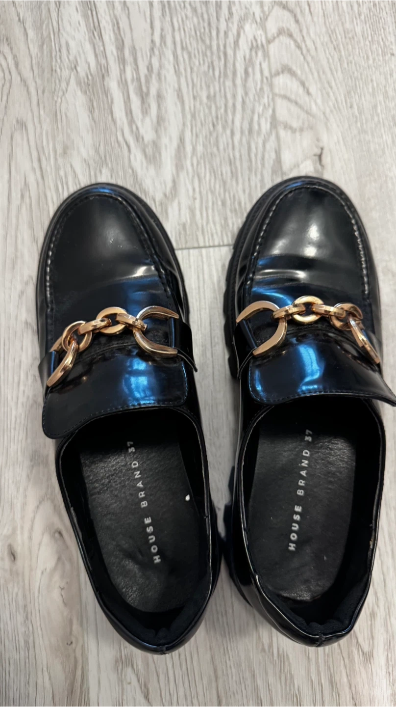 Selling a pair of black loafers from House Brand. They have a gold chain detail across the top. The size is 37.