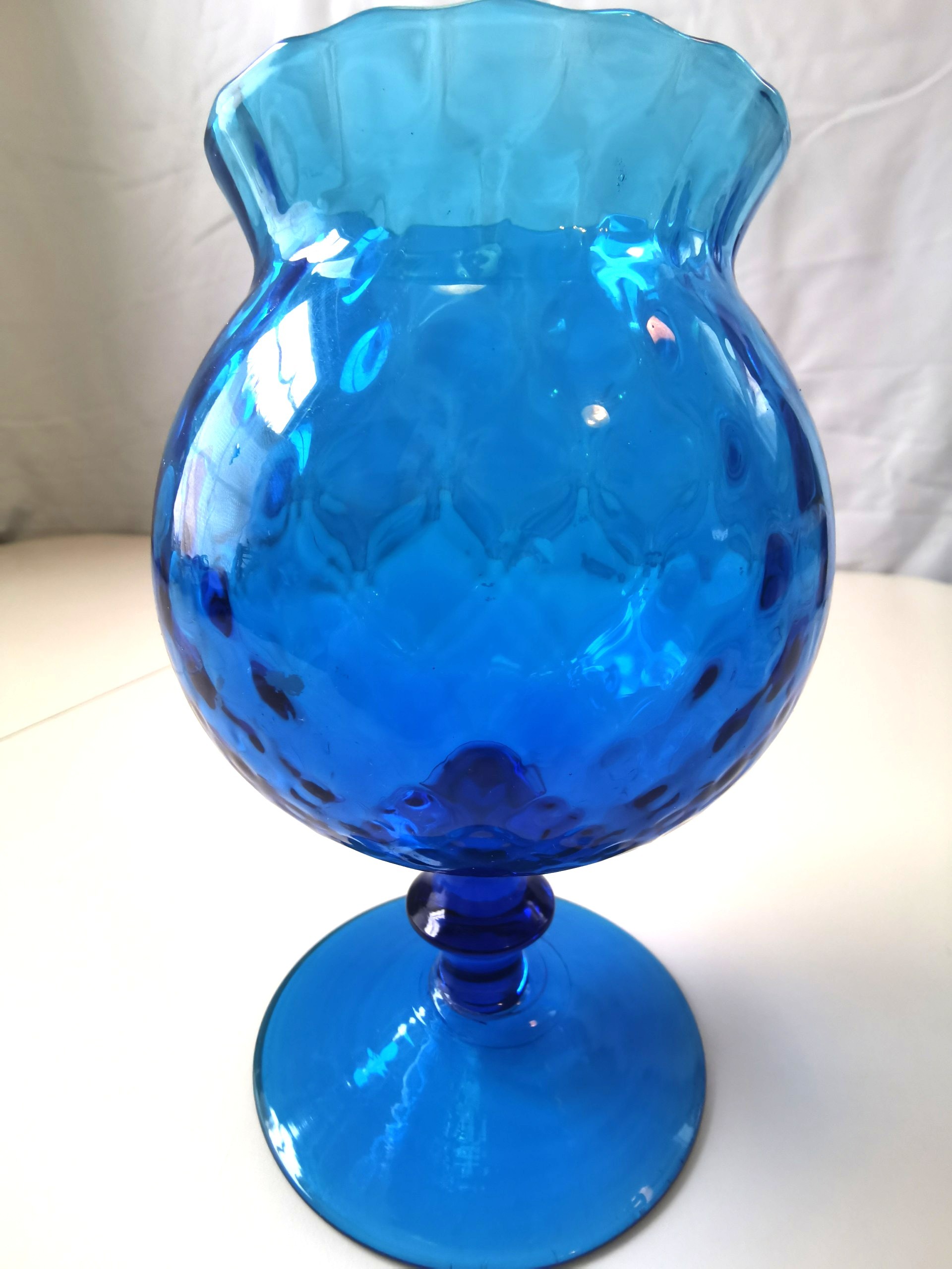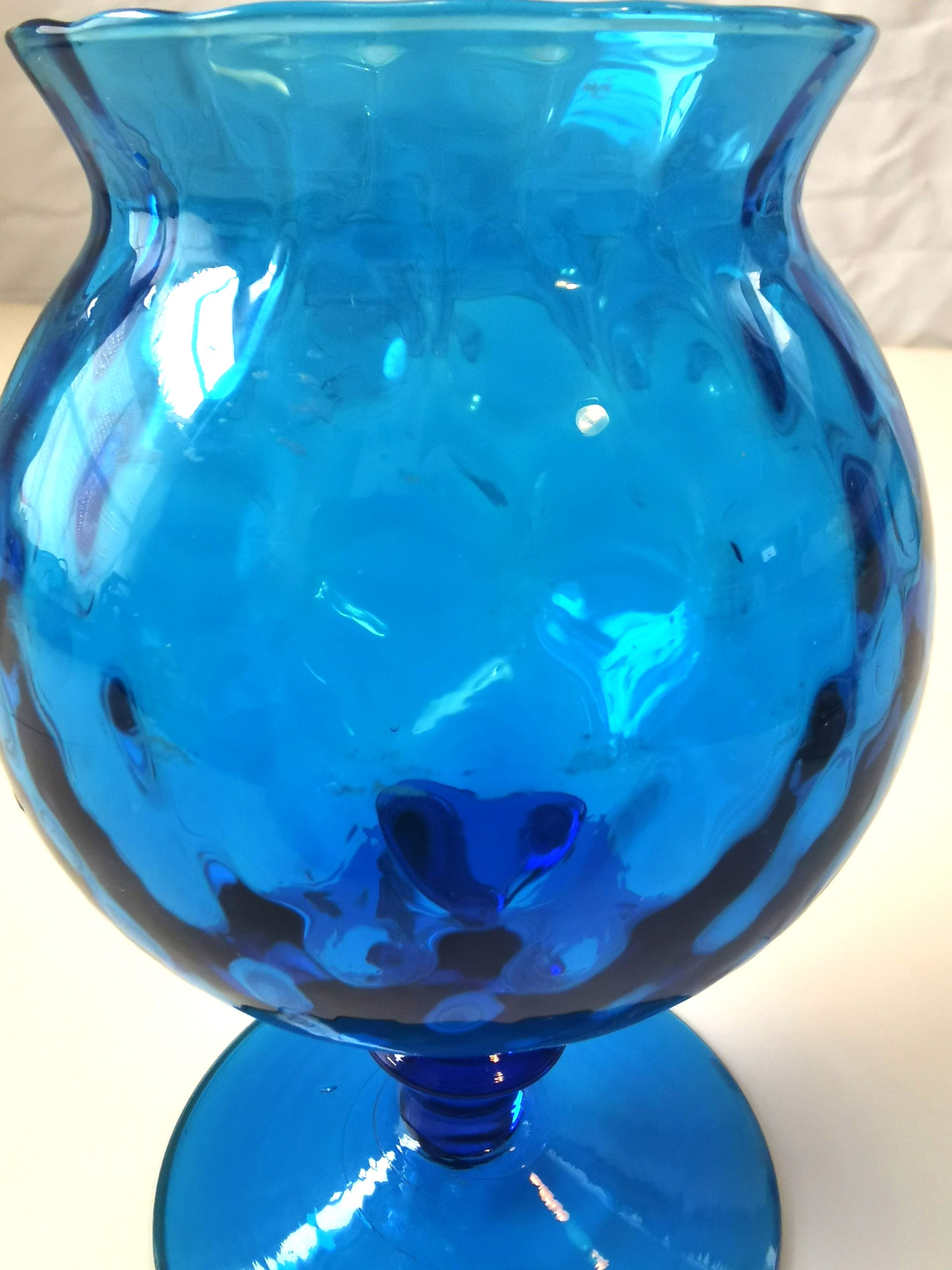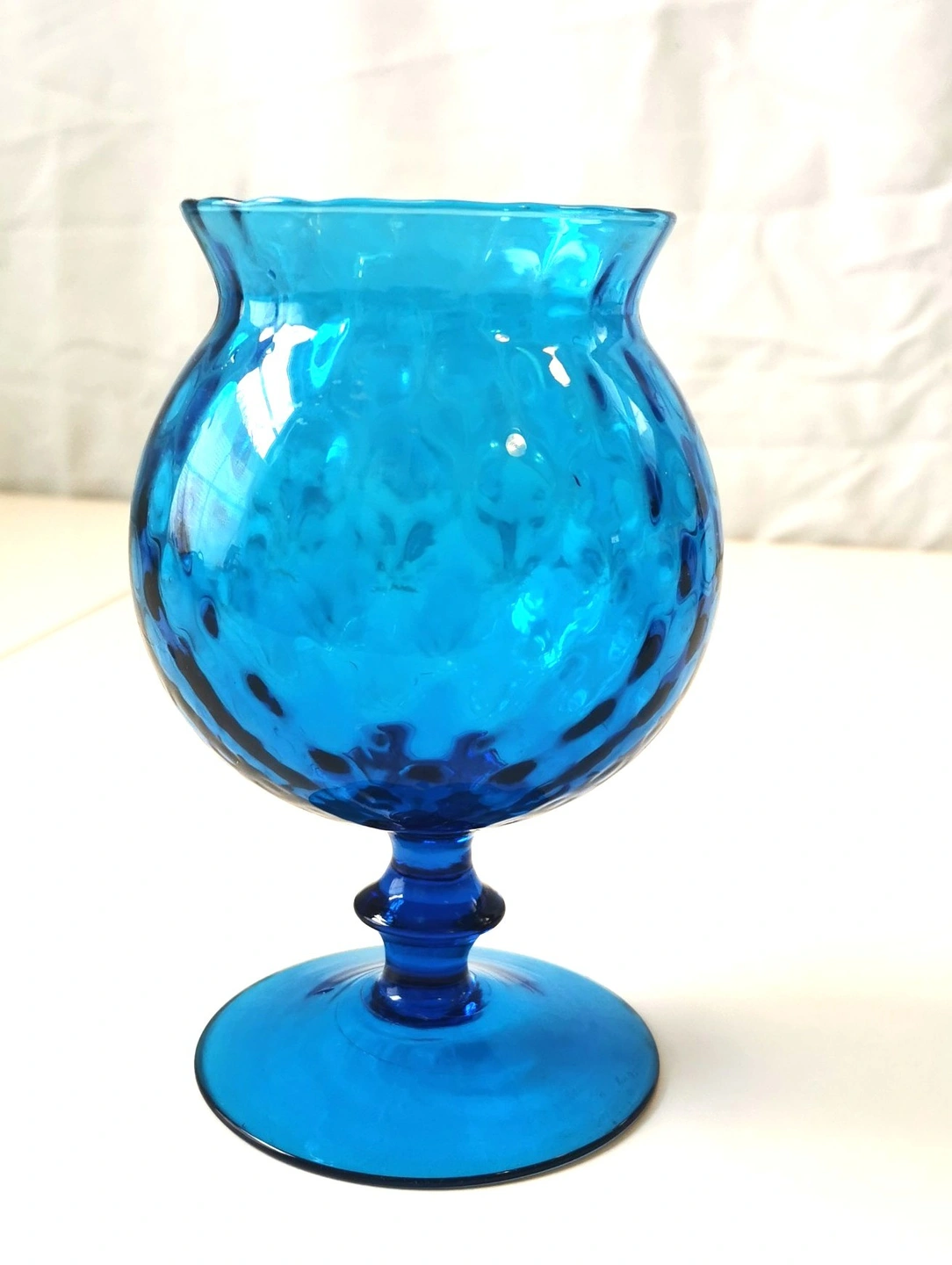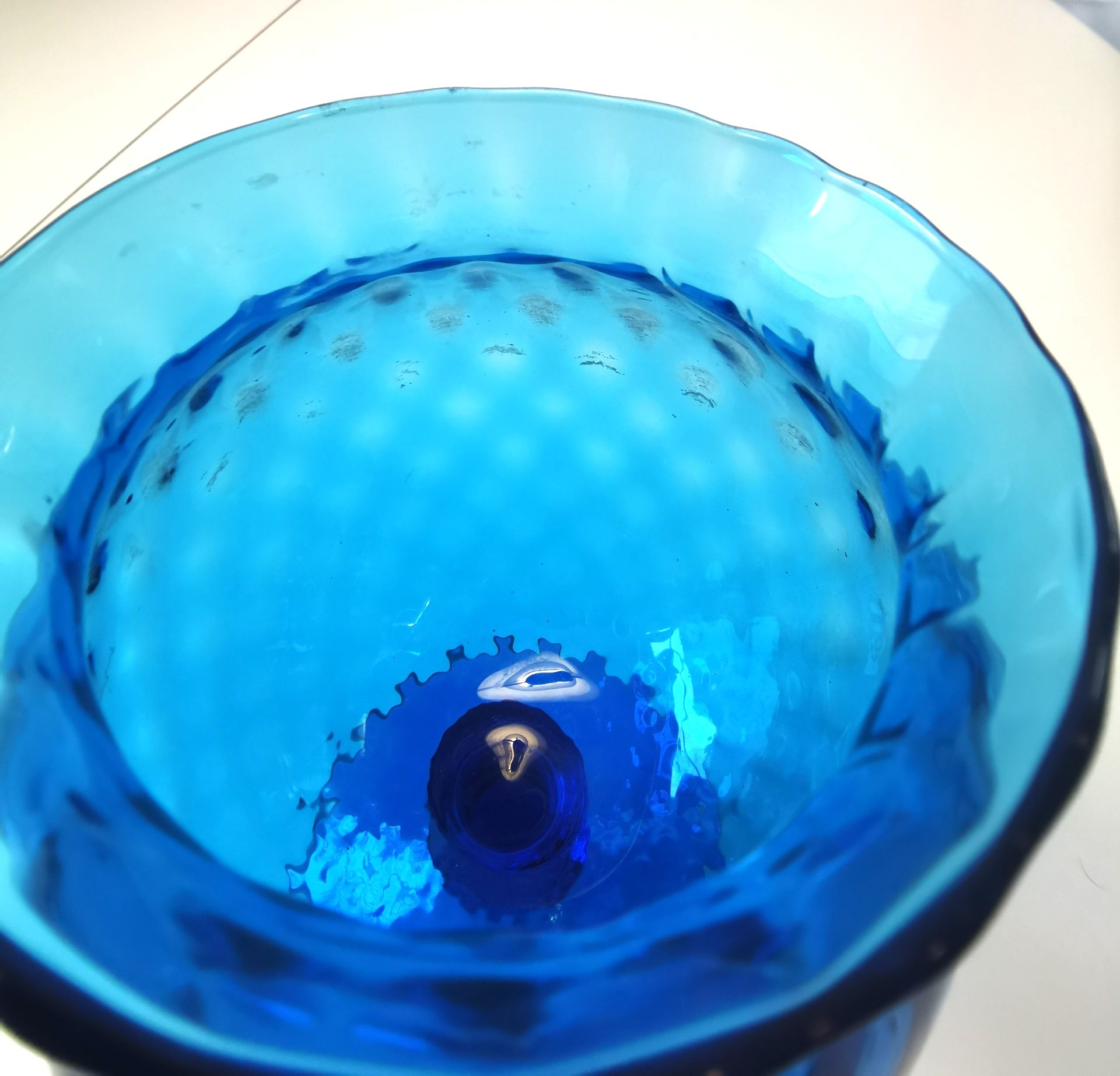 Brand: Indiana Glass Company (Colony Line) Pattern: King’s Crown (Thumbprint) Color: Riviera Blue (Transparent Light Blue/Aqua) Circa: 1971 Dimensions: 7" Height | 4.75" Rim Diameter | 3.5" Base Diameter