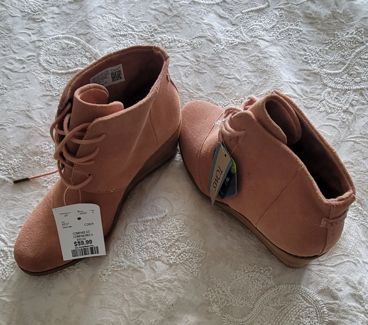 These TOMS wedge booties are in great condition! They're a lovely lightpinky tan suede and are a women's size 8. 5. The tag shows they retail for $39.99.