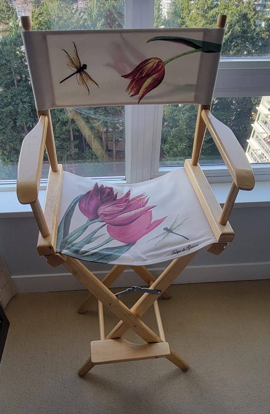 Selling a director's chair with a lovely Tulipe de Gasner design! It features beautiful tulips and dragonflies on the canvas seat and back. The frame is made of light-coloured wood. It's in great shape and ready for a new owner!