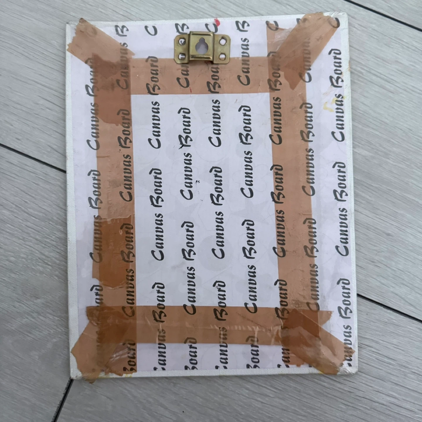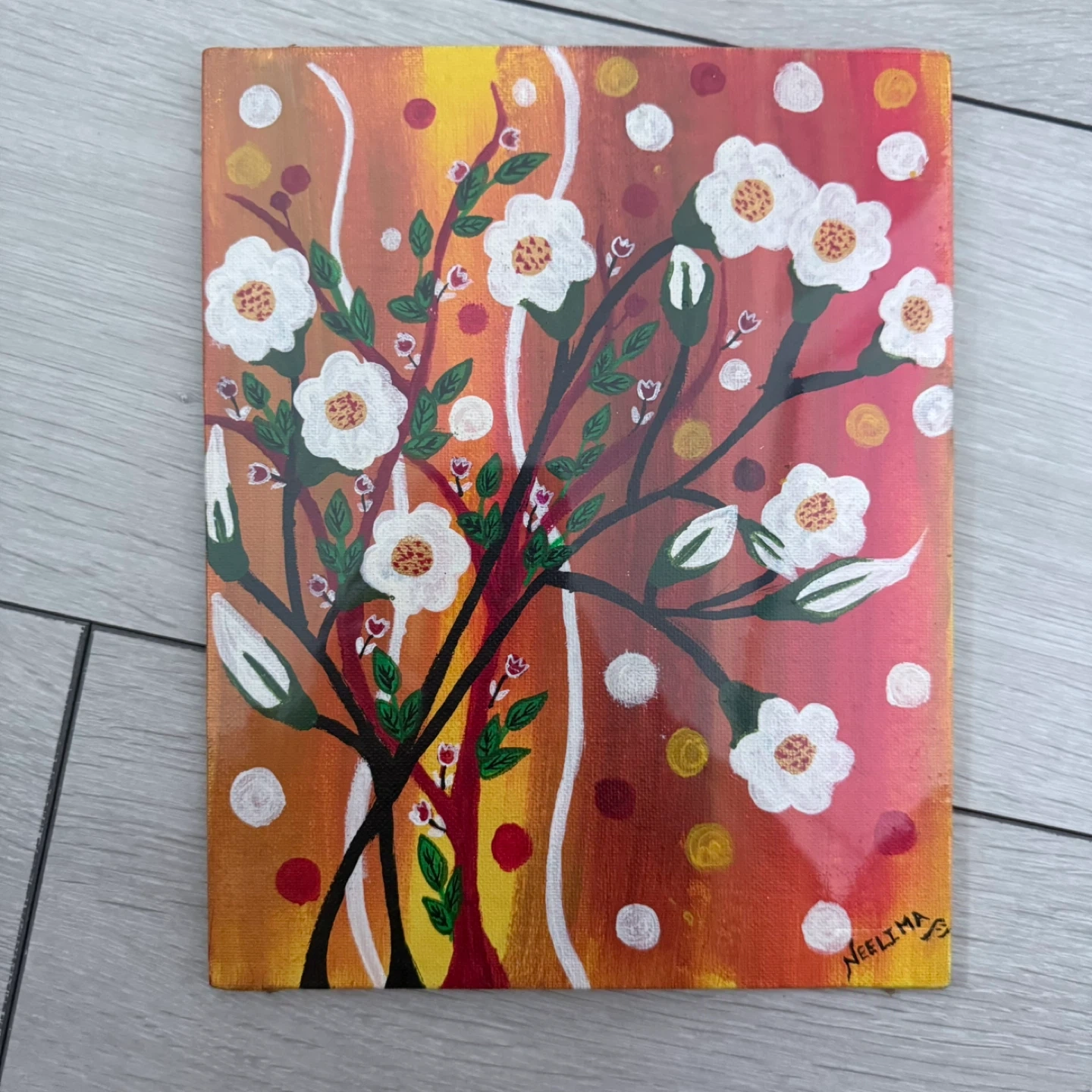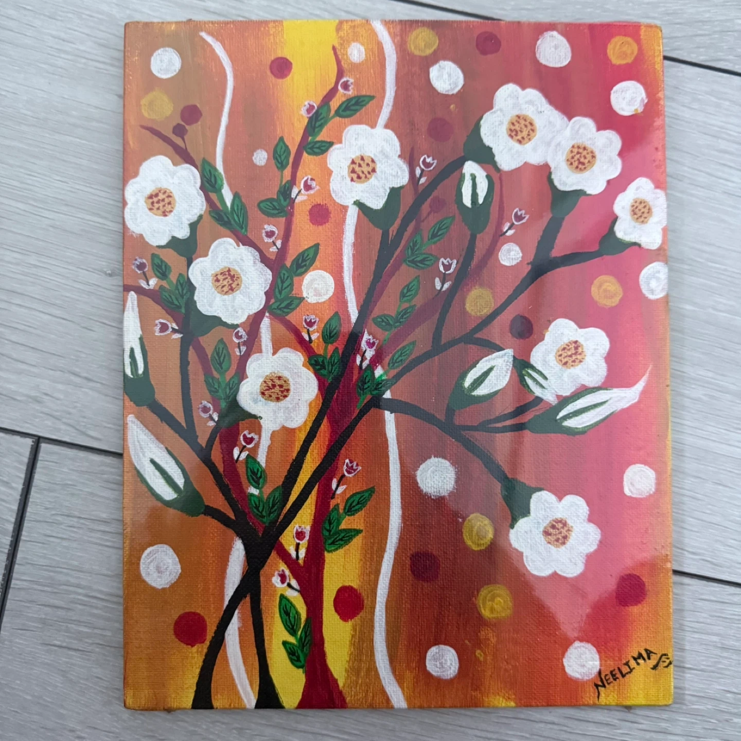 Here's an original floral painting on a canvas board. The painting features white flowers with green leaves against a warm, colourful background. It's a unique piece that would add a touch of charm to any room!