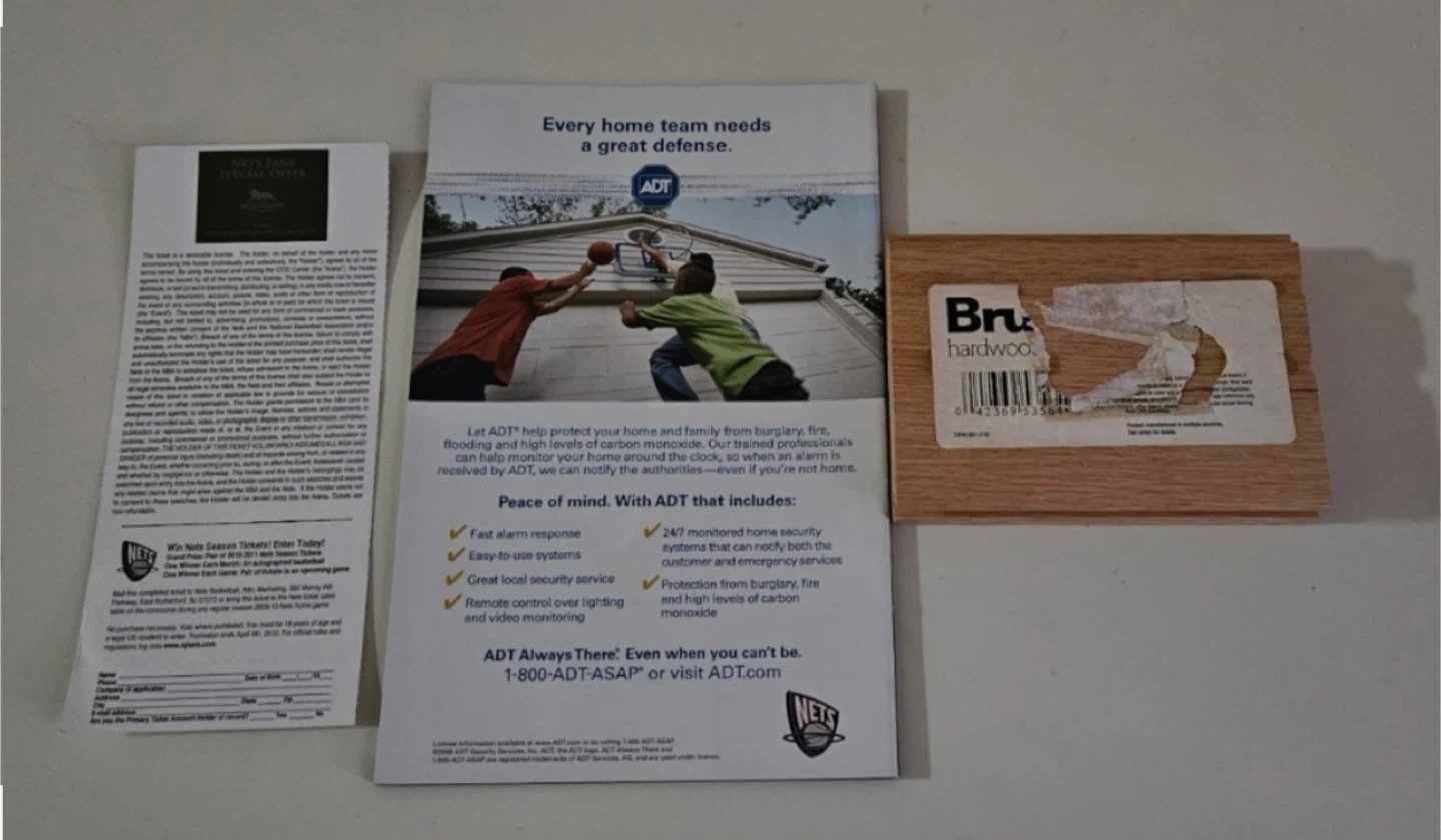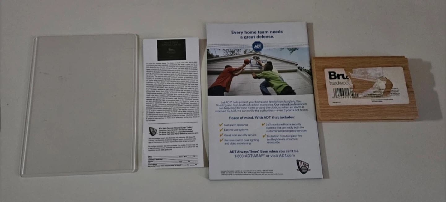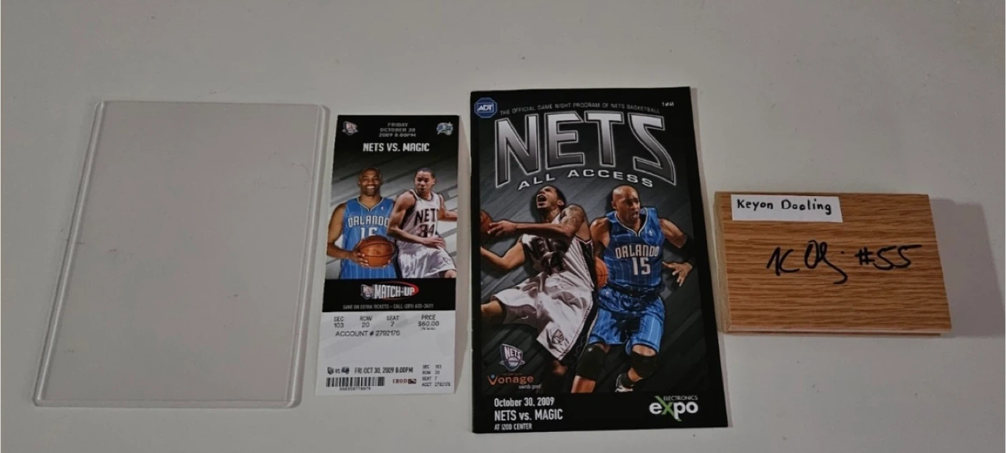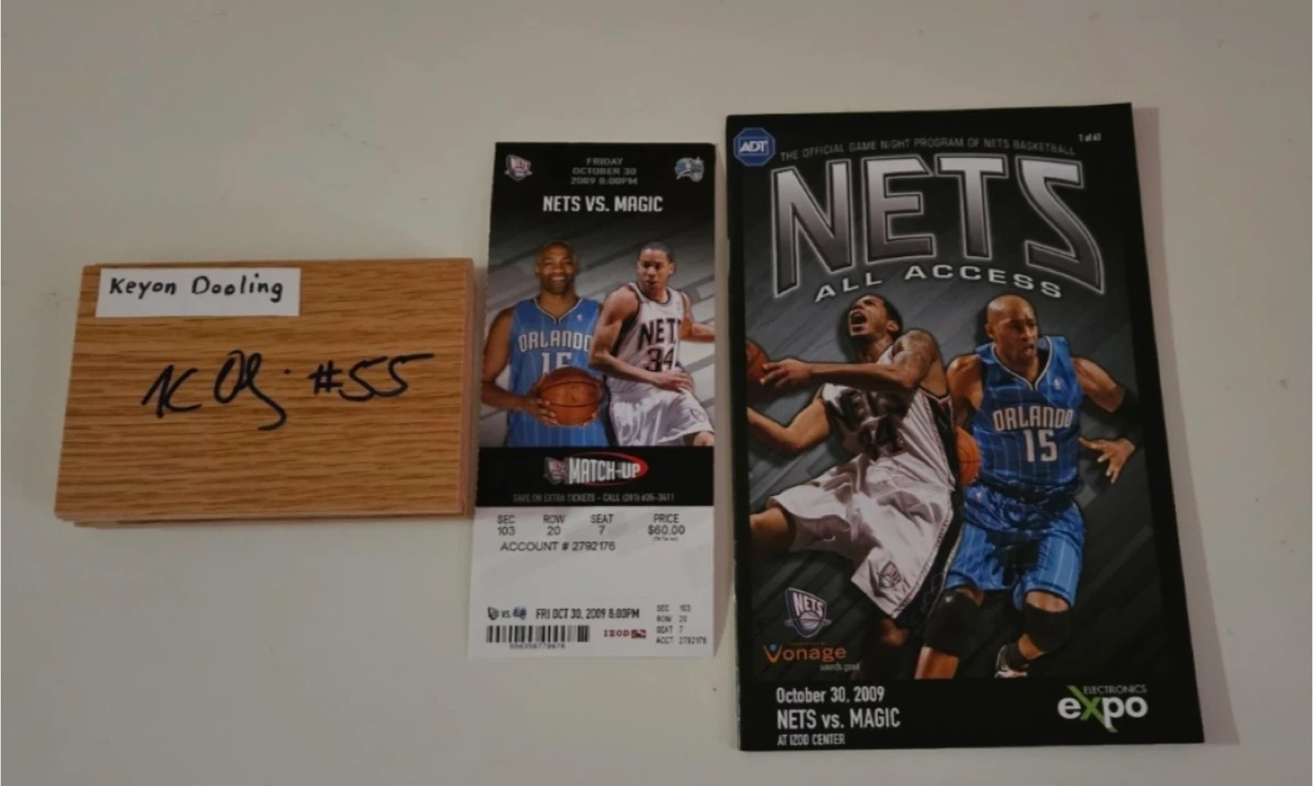 The items are a signed floorboard by Keyon Dooling of the New York Nets, accompanied by the game ticket and the program. This unique item is an original autograph from the NBA player, making it a valuable memorabilia piece for fans of basketball and sports memorabilia. The autographed floorboard was personally obtained by me before the game at the IZOD Center, N.J. on October 30,2009. The unsigned ticket will come in a top loader.