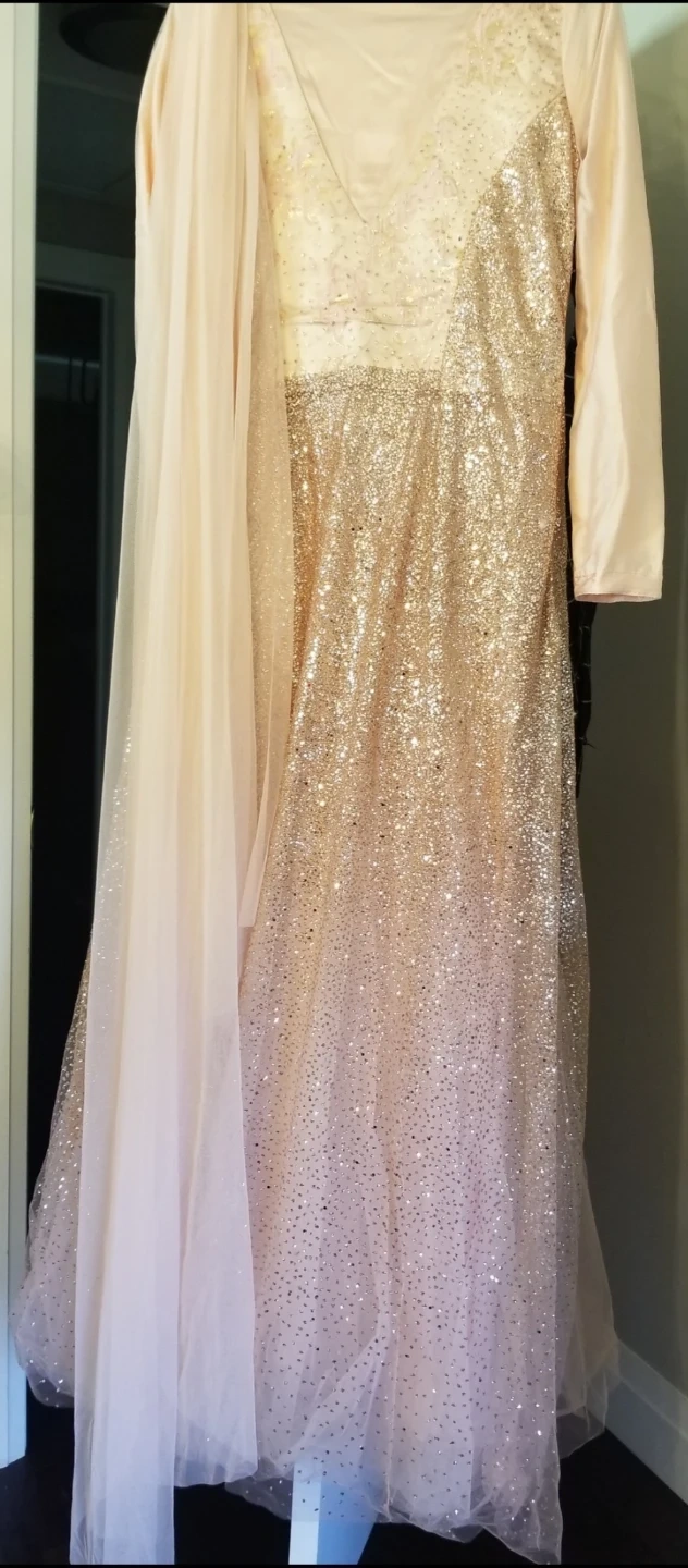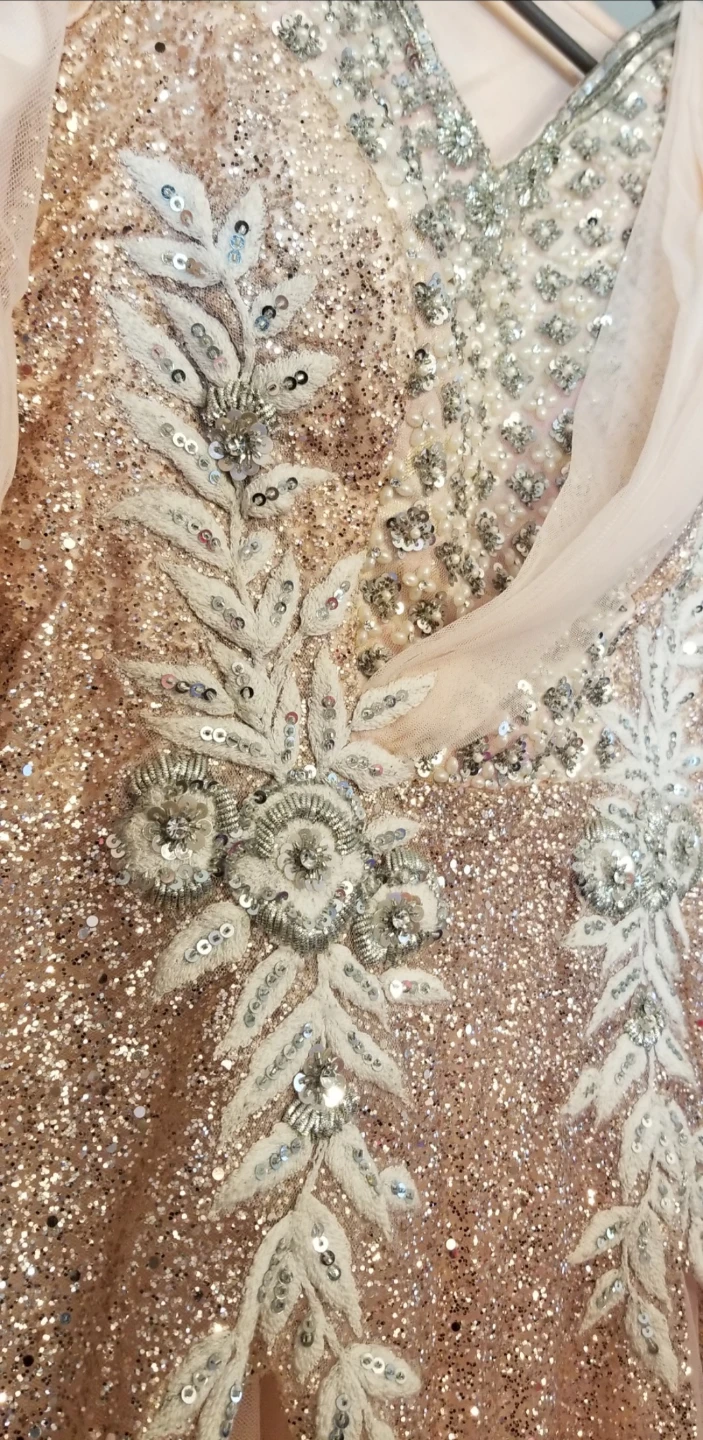 Selling a beautiful sparkly formal dress! It features a sequined bodice and a flowy dress. Perfect for a special occasion! Size small, peach and silver. $100.